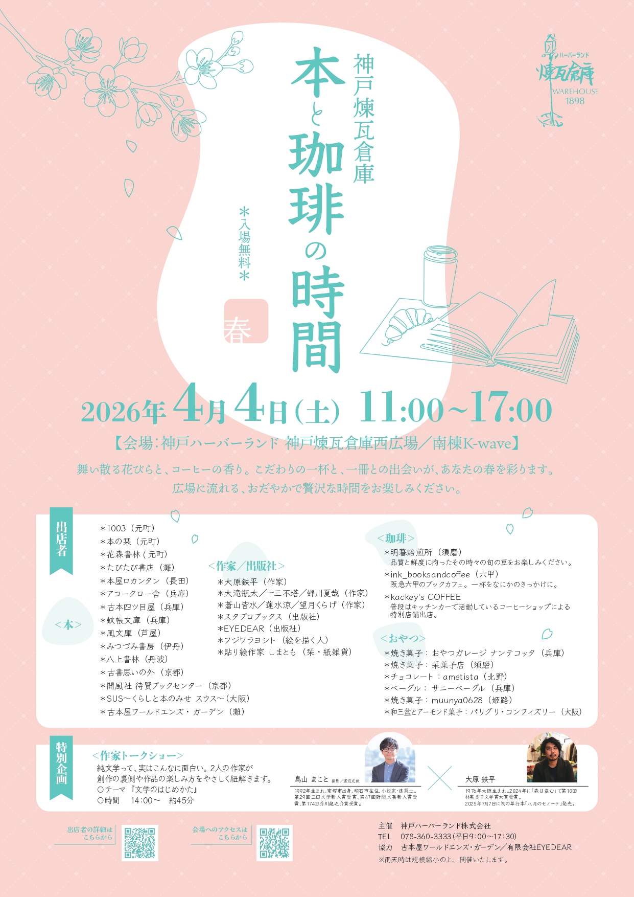 神戸煉瓦倉庫西広場、南棟K-waveで「本と珈琲の時間」が4月4日(土)に開催予定。第174回芥川賞作家によるトークショーも特別開催!こだわりの一杯と一冊との出会いが春を彩ります♪ #イベント #本と珈琲の時間 #神戸煉瓦倉庫