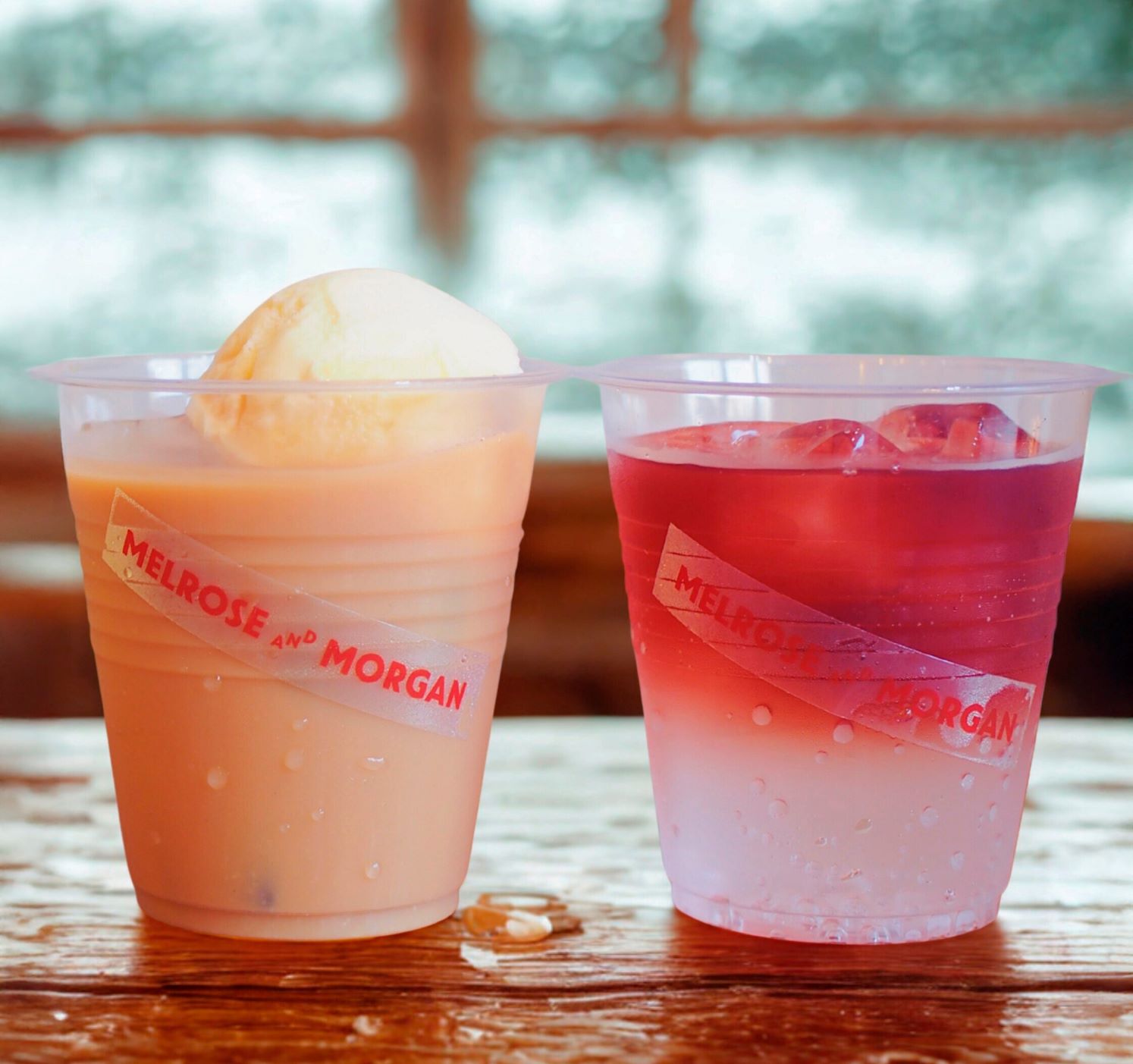 (左)ミルクティーフロート(1杯)748円 濃厚なミルクティーに塩ミルクアイスを浮かべました。(右)ベリー・ティーソーダ(1杯)594円 甘い香りと程よい酸味が楽しめるノンカフェインのティーソーダ。