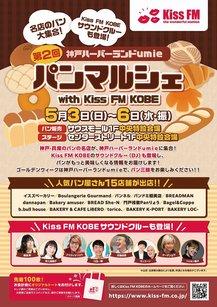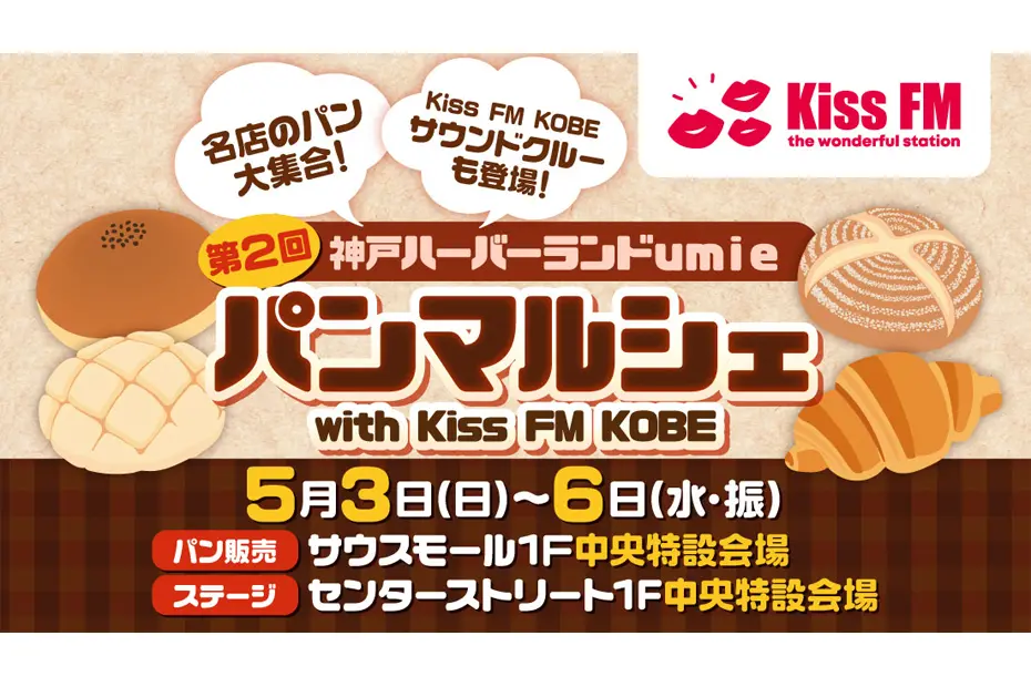 兵庫県内のパンの名店が、神戸ハーバーランドumieに集合!Kiss FM KOBEのサウンドクルー(DJ)も登場し、パンがもっと美味しくなる情報をお届けします!また、サウンドクルーによるコラボパンも販売!ゴールデンウィークは神戸ハーバーランドumieで、パン三昧をお楽しみください!!