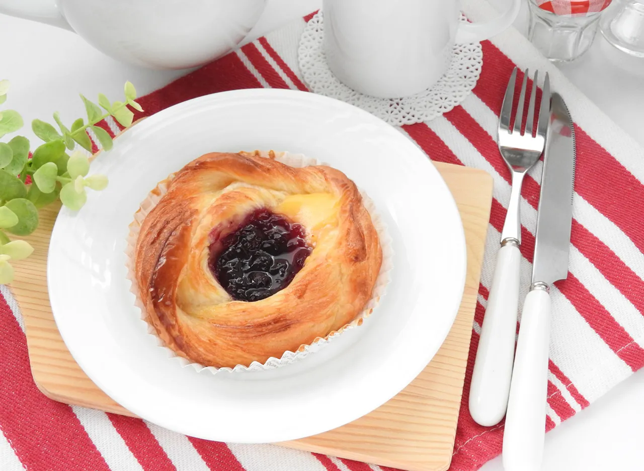 デニッシュ生地にカスターと果肉入りブルーベリージャムを絞りました。