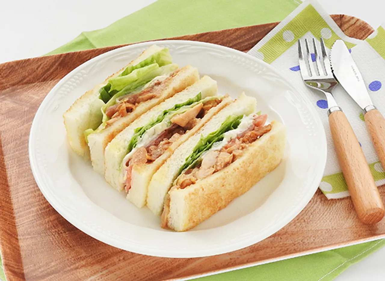 トーストしたパンにベーコン・照り焼きチキン・レタス・トマトをタルタルソースで仕上げ、粒マスタードでアクセントを付けました。