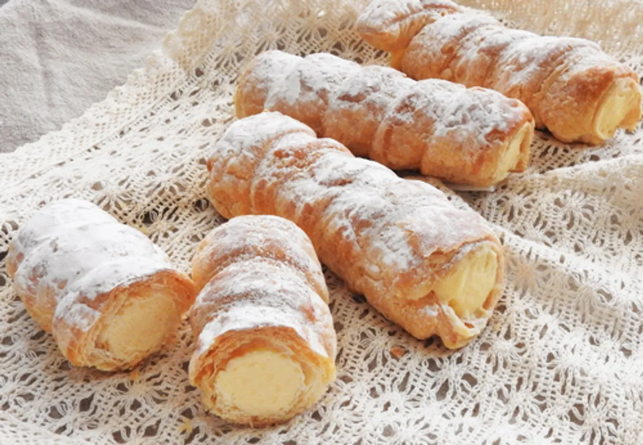 バターの風味豊かなサクサク食感のフレンチパイ生地に自家製カスタード入り生クリームをたっぷり詰めました。(お客様へお渡しするまで氷温にて保管しております。凍結している場合は冷蔵庫で1時間程度保管していただくと美味しくお召し上がりいただけます。)