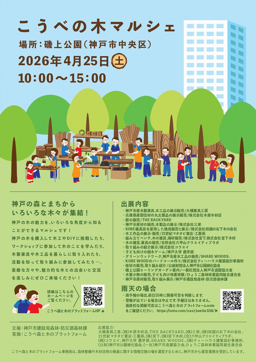 神戸の木の魅力をいろいろな角度から知ることができる「こうべ木のマルシェ」が磯上公園で4月25日(土)に開催されます。