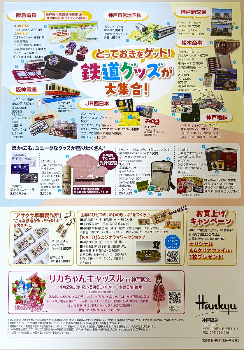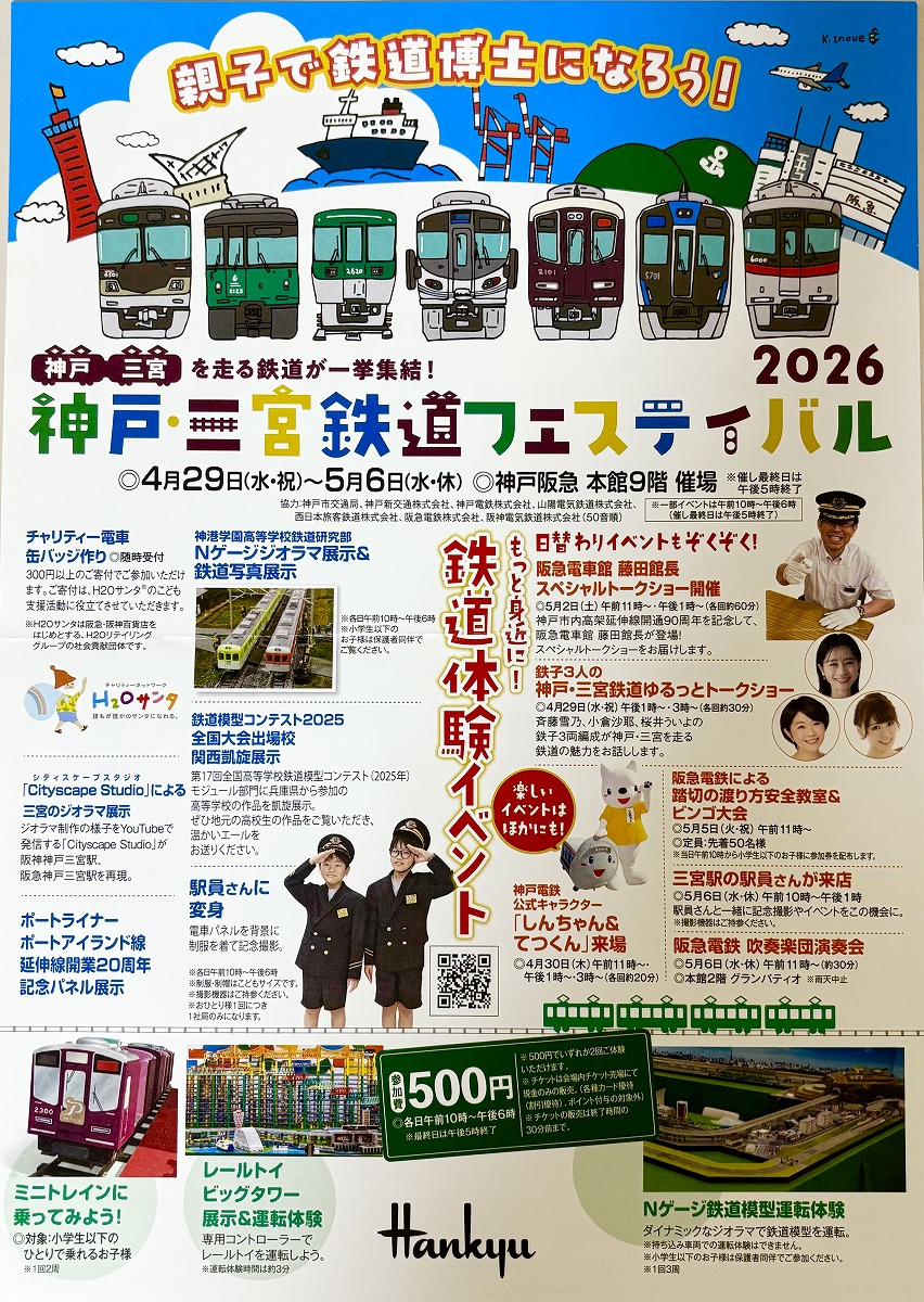 神戸阪急さんの本館9階催場で「神戸・三宮鉄道フェスティバル2026」が4月29日(水・祝)~5月6日(水・祝)まで開催予定ということで、ご案内をお寄せ頂きました。