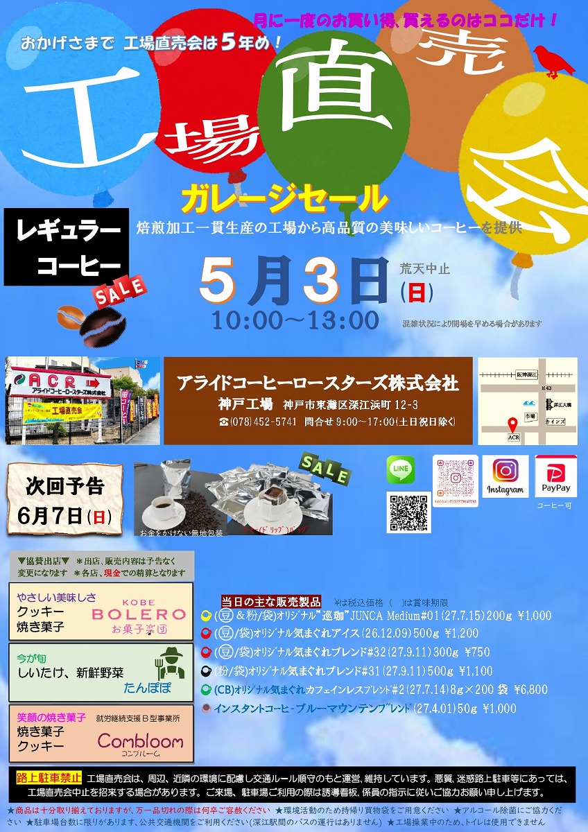 東灘・深江浜町にある「アライドコーヒーロースターズ」さんで、お得な「ガレージセール 工場直売会」が5月3日(日)10時~13時に開催!月に一度のお買い得セールをお見逃しなく♪ #東灘区 #アライドコーヒーロースターズ #イベント #コーヒー