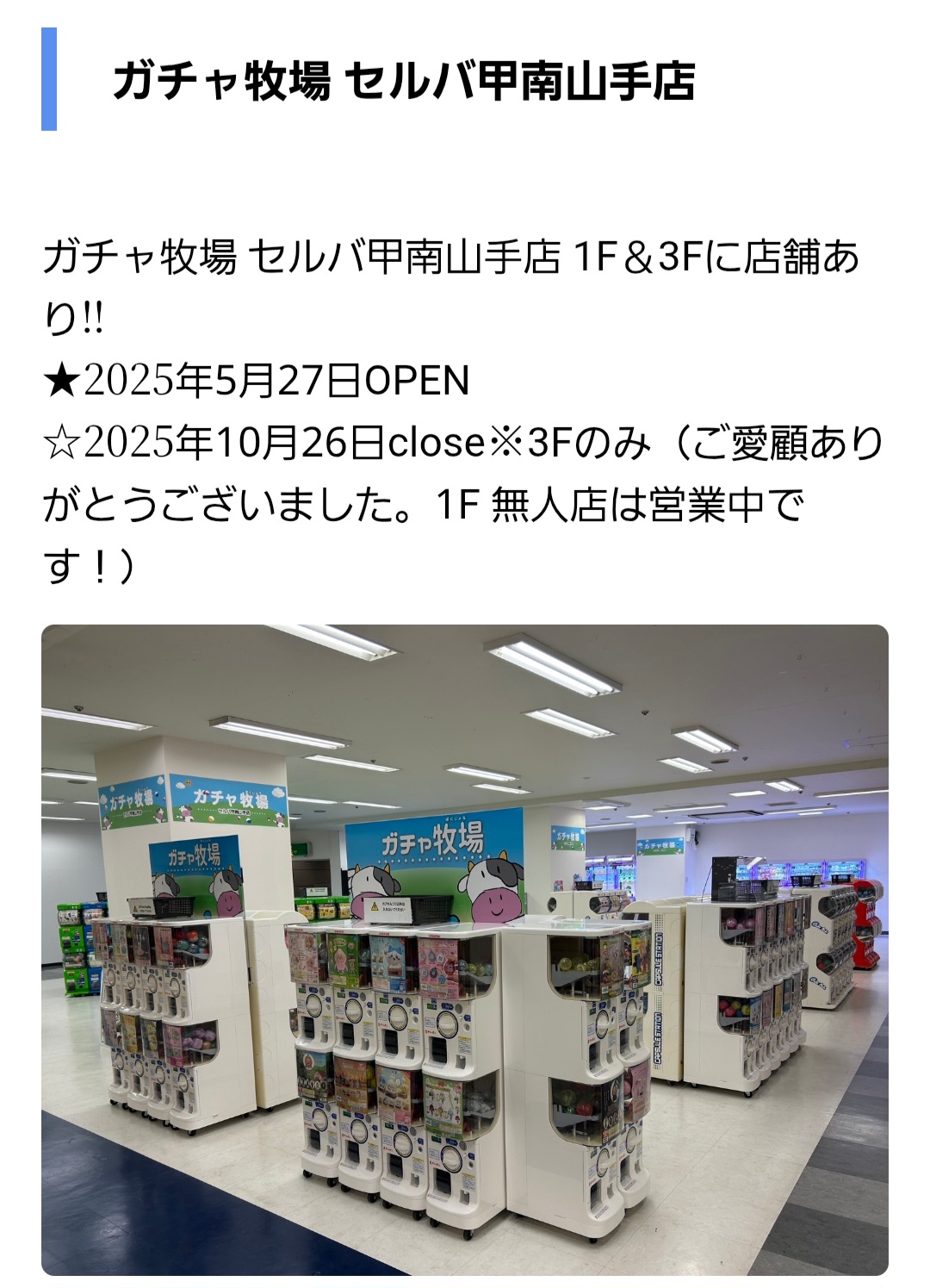 【※追加更新】東灘・セルバ甲南山手のカプセルトイ専門店 「ガチャ牧場 セルバ甲南山手店」さんの3階エリアが2025年10月26日をもって閉店されました #東灘区 #ガチャ牧場