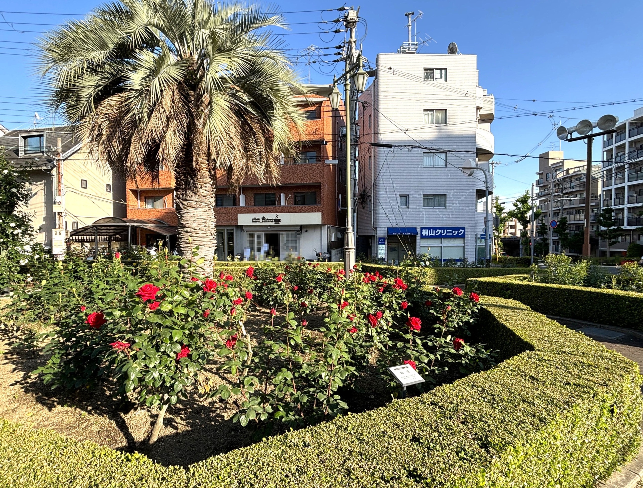 JR摂津本山駅より北西へ約5分程、山手幹線沿い「岡本交差点」のそばにある「本山街園 バラ園」がこちら。