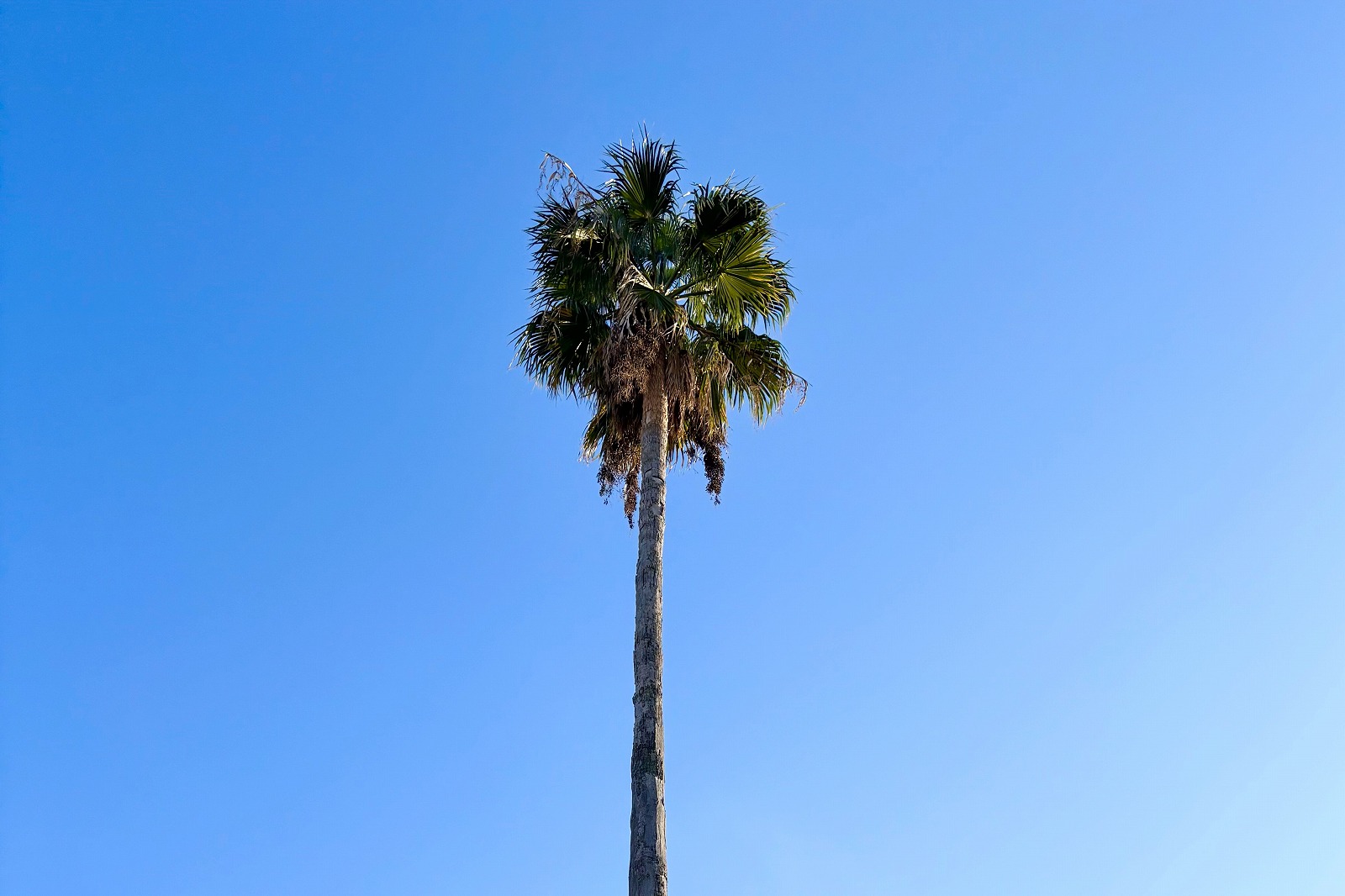 園内の真ん中に生えているヤシの木(「ワシントニア・ロブスタ」(和名:ワシントンヤシモドキ)という種類だそう)がこちら。見上げると20mぐらいありそうな、背高な木です。