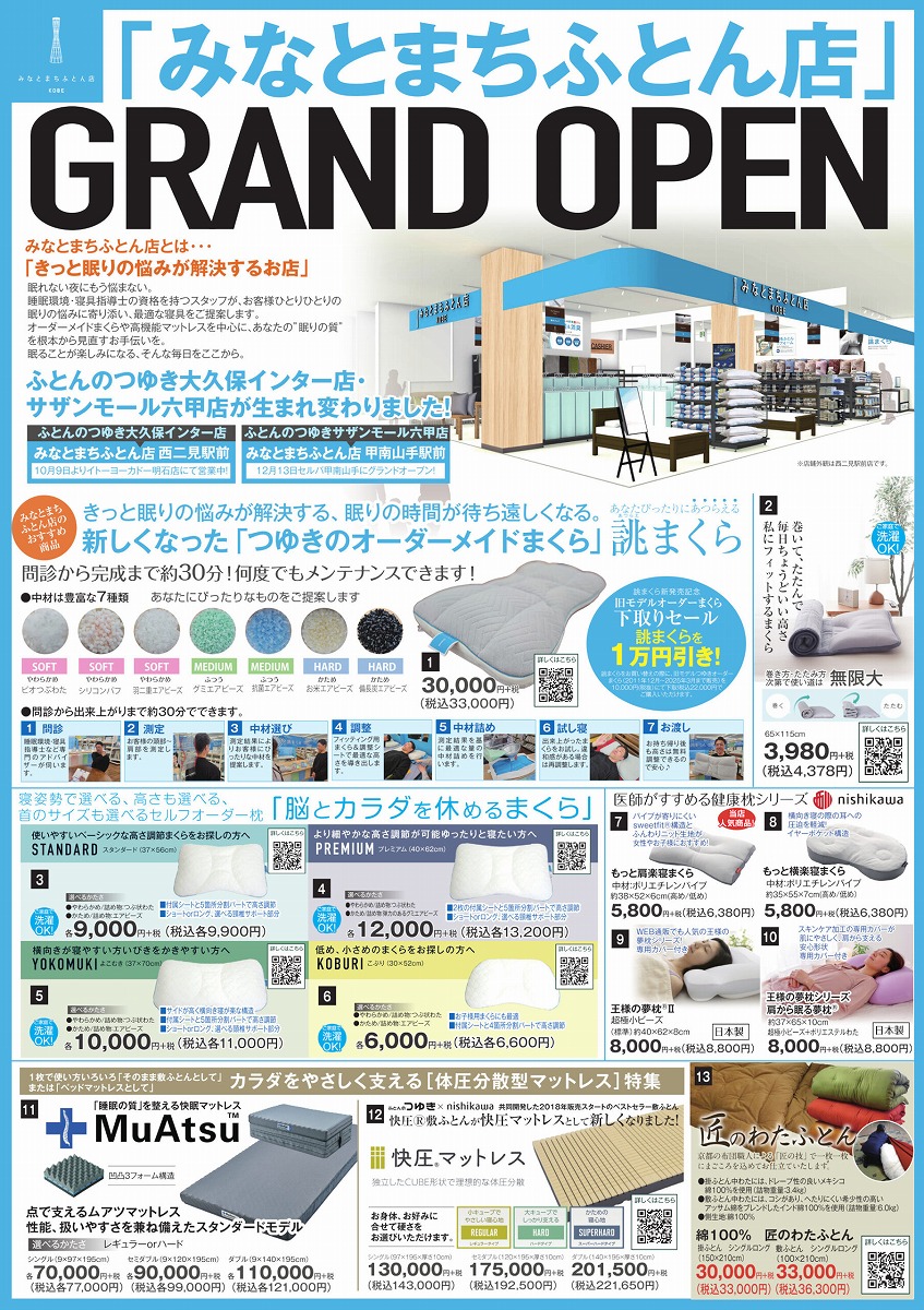 オープンセールの告知チラシでは、オーダーメイドまくらやマットレスなどの他、