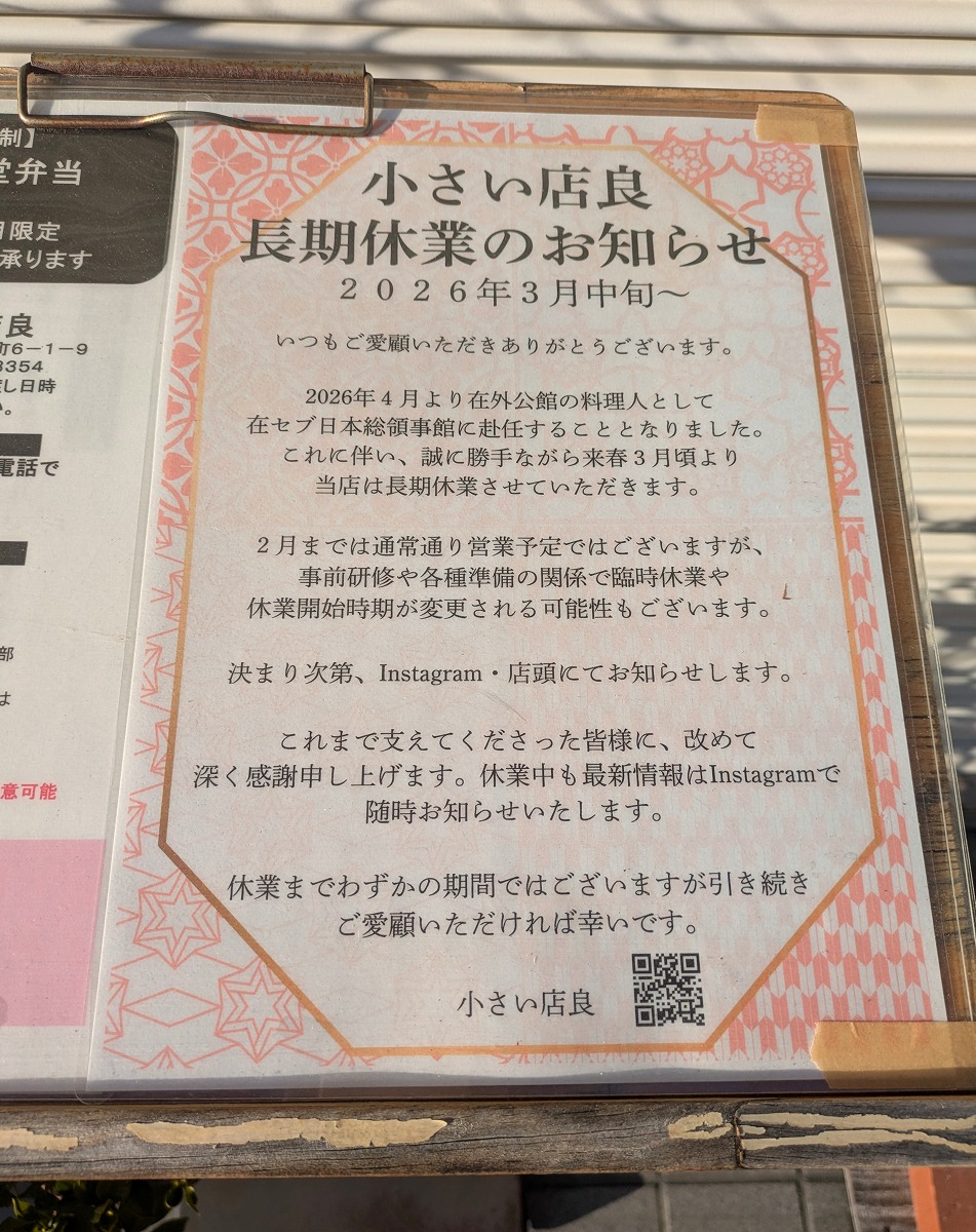 お寄せいただいたお知らせがこちら。2026年4月より在外公館の料理人として、在セブ日本総領事館に赴任されるそうで(すごい!)これに伴い【2026年3月中旬頃(日時未定)】より長期休業を予定されています。このたびはご案内をありがとうございました。※詳細等 決まり次第、Instagram・店頭にてお知らせがあるそうで、ご確認いただければと思います。