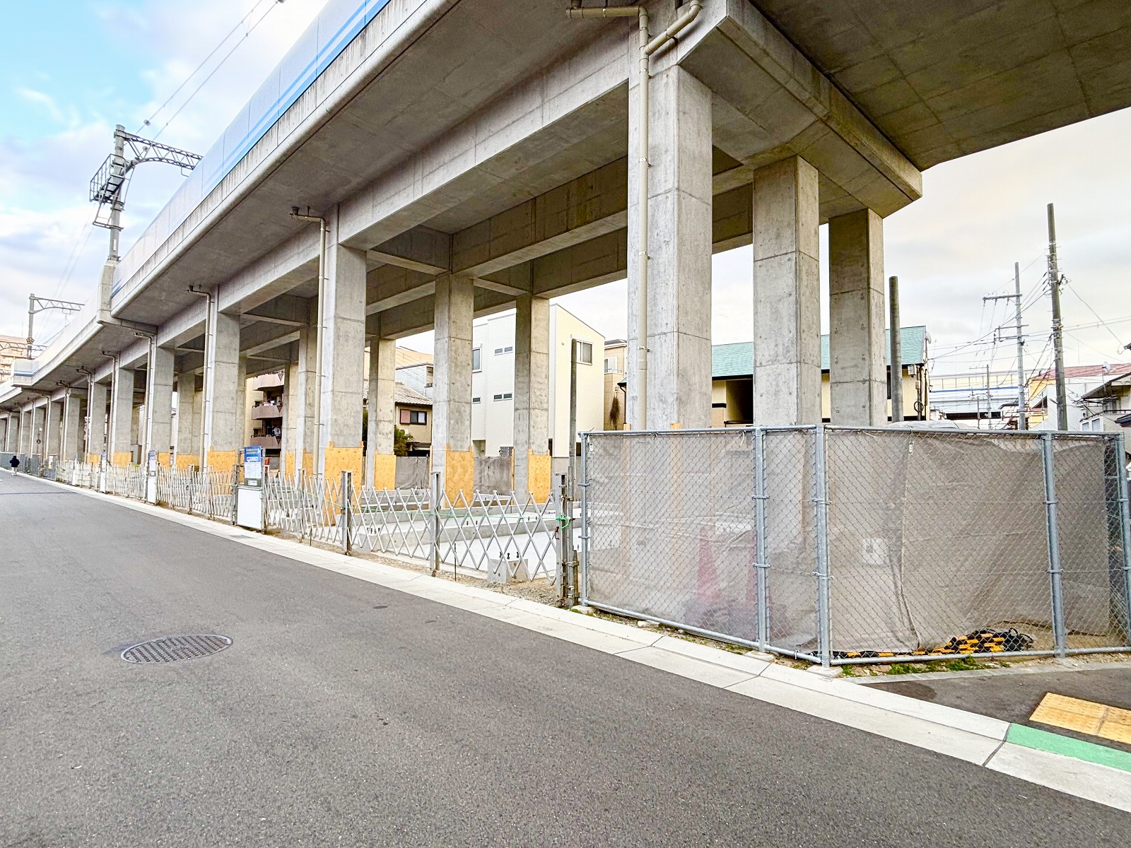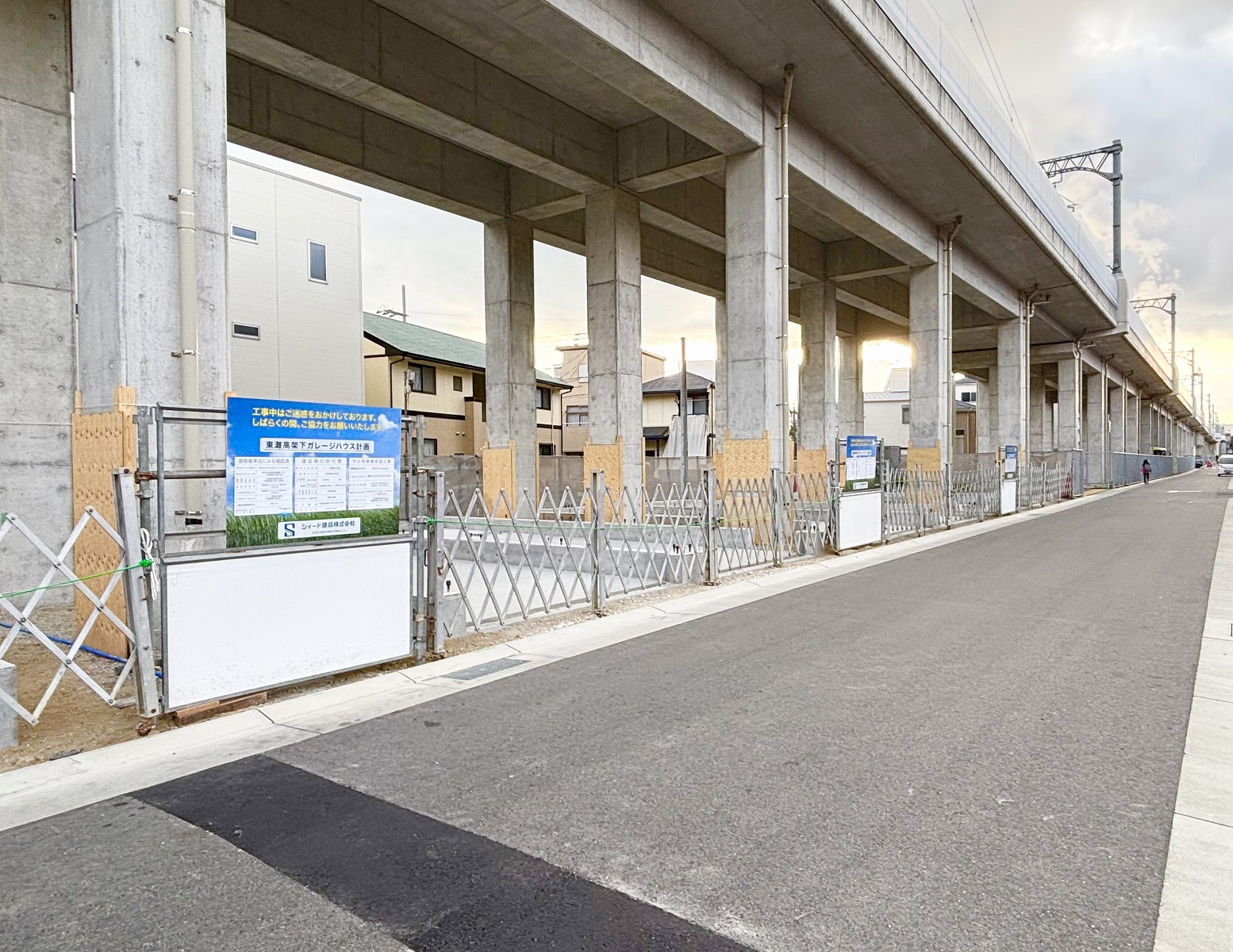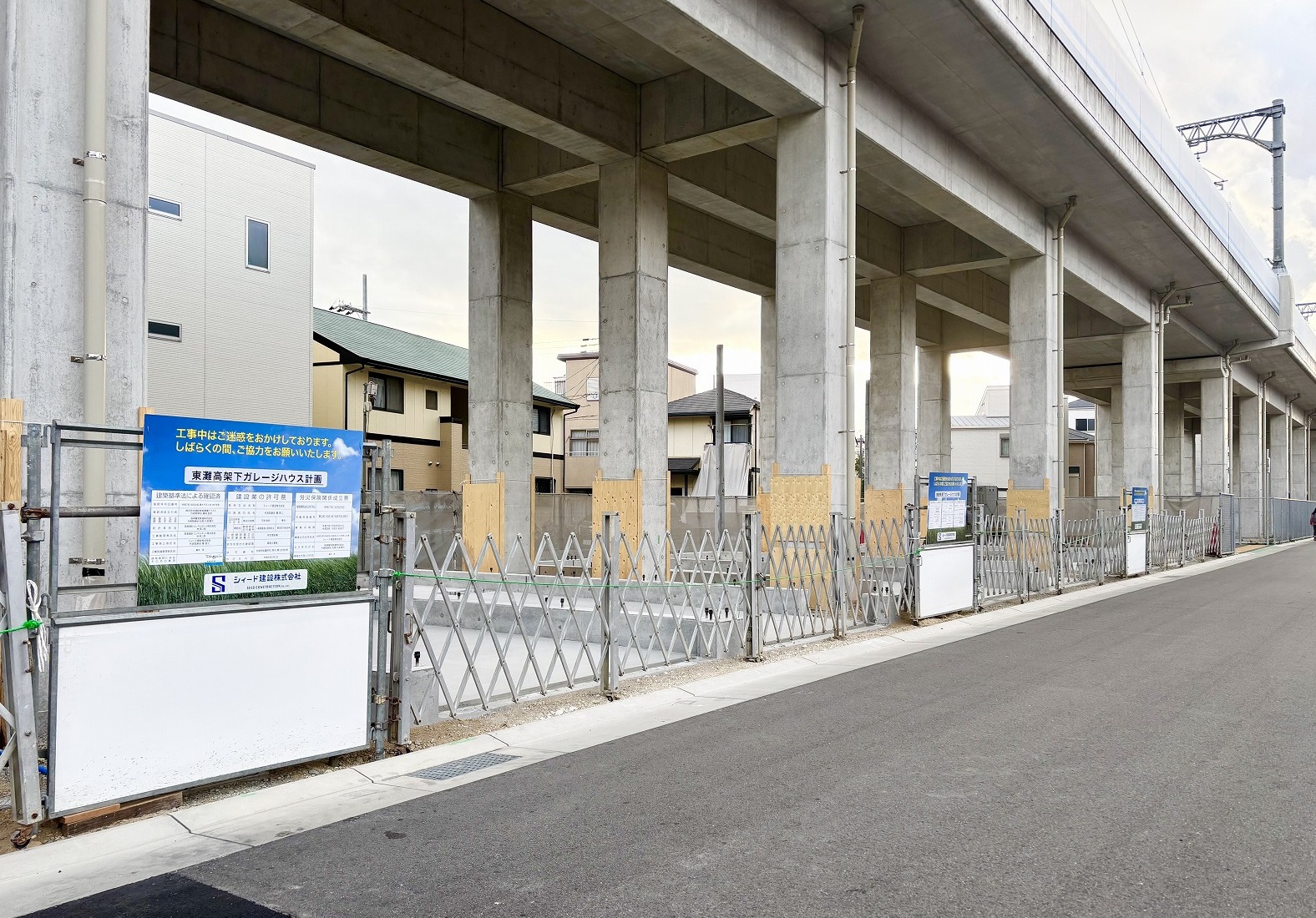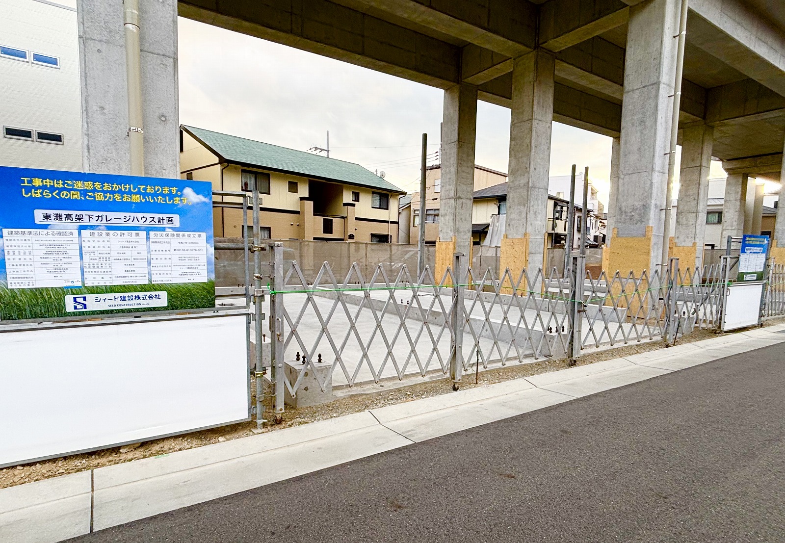 建設中の「(仮称)東灘高架下ガレージハウス」がこちら。