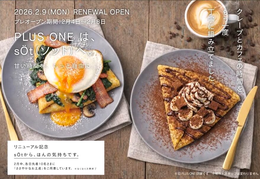 「PLUS ONE」さんが「sÖt(ソット)」さんとして2月9日(月)リニューアルオープン予定!