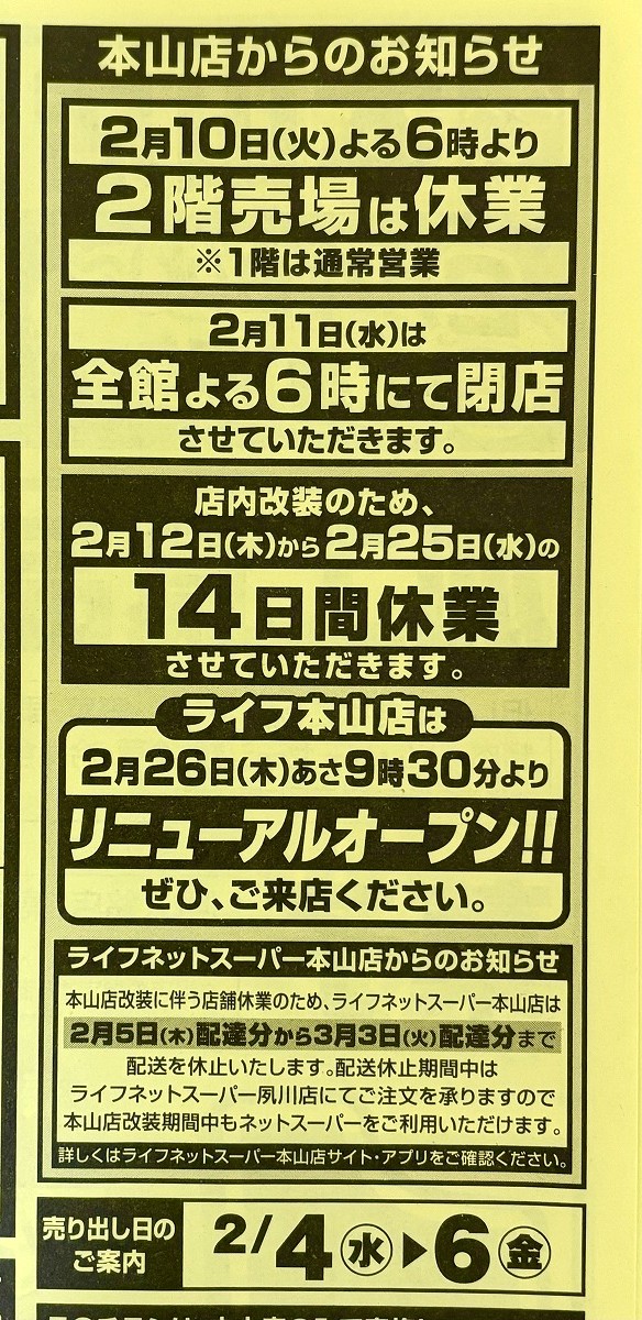 「ライフ本山店」さんが改装に伴い、2月12日(木)~2月25日(水)は全館休業へ