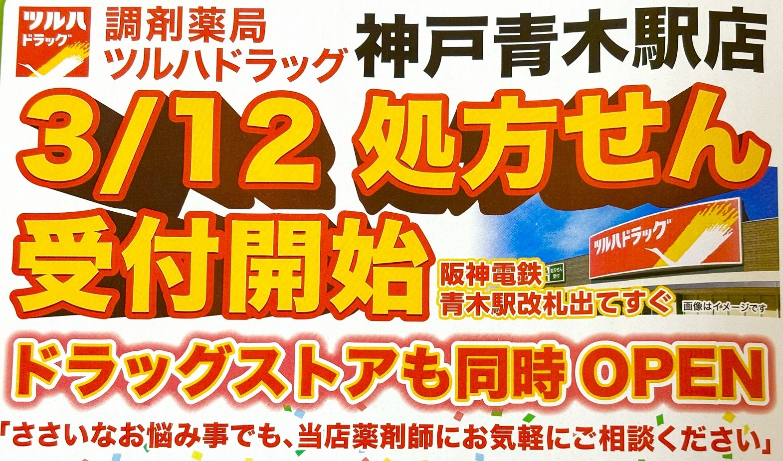 阪神青木駅前に「ツルハドラッグ 神戸青木駅店」さんが2026年3月12日(木)にオープン!調剤薬局の他、化粧品や日用品、食品やお酒の取り扱いもあるみたい #新規オープン #新店情報 #東灘区 #ツルハドラッグ #開店情報