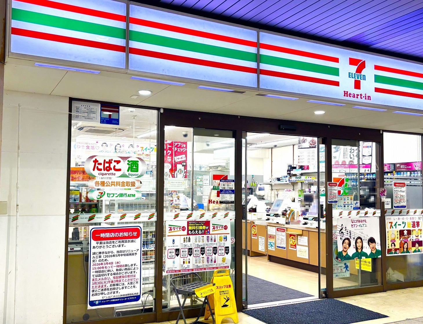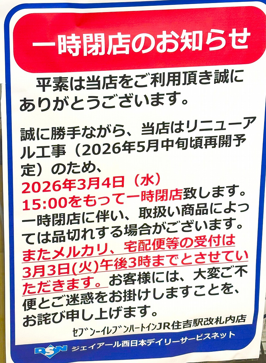 「セブン-イレブン ハートインJR住吉駅改札内店」さんが2026年3月4日(水)15時をもって一時閉店へ
