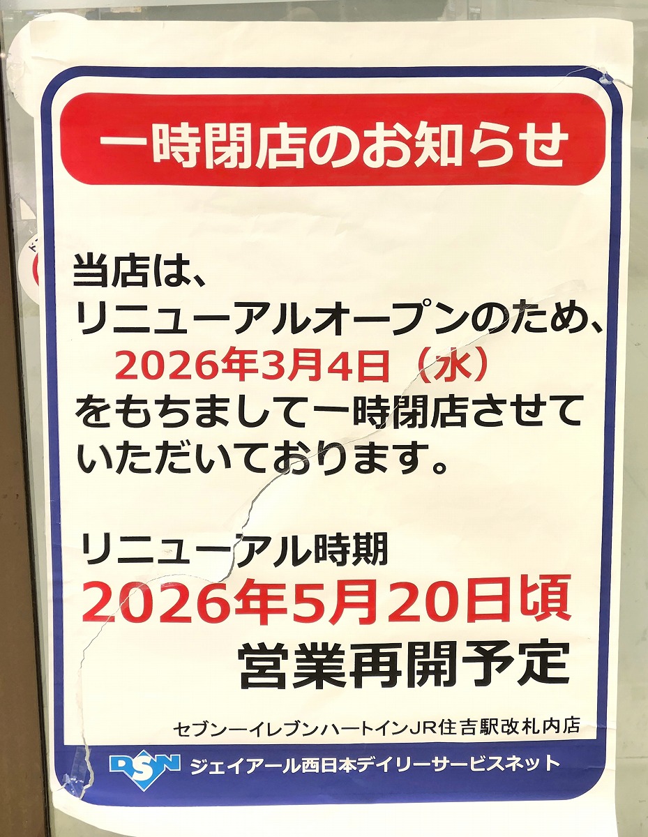 「セブン-イレブン ハートインJR住吉駅改札内店」さんが2026年3月4日(水)15時をもって一時閉店へ