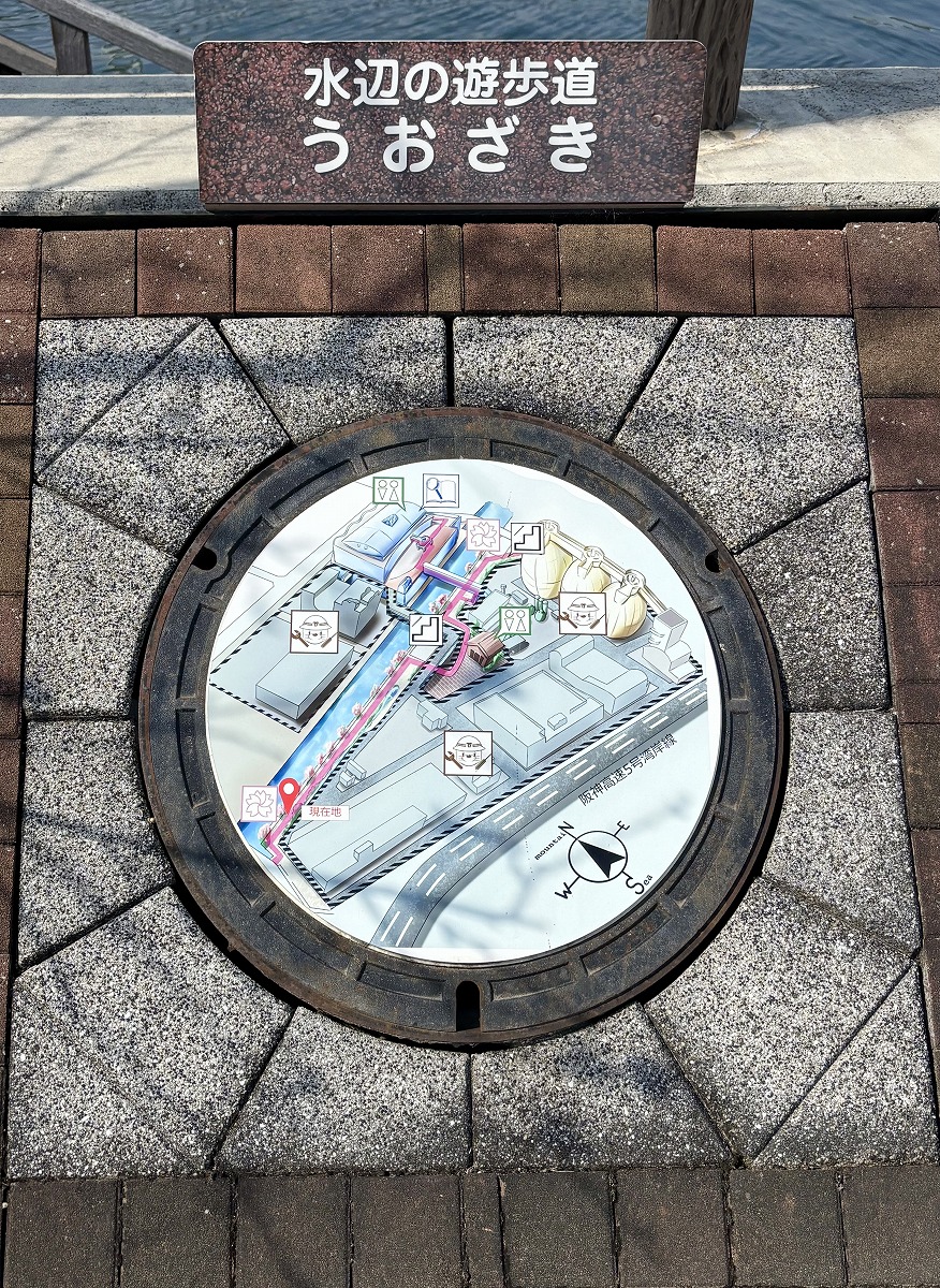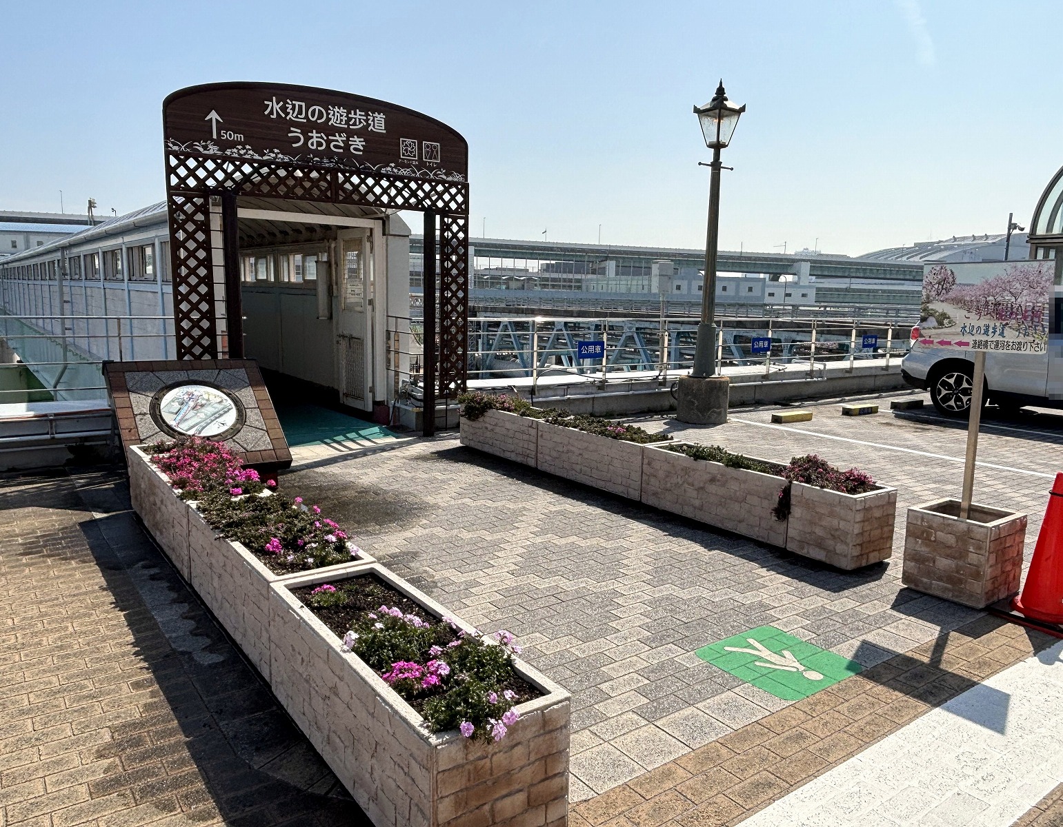 管理棟のすぐ南側に、水辺の遊歩道・うおざきへと続くコンコースがあります。こちらを渡っていきましょう。