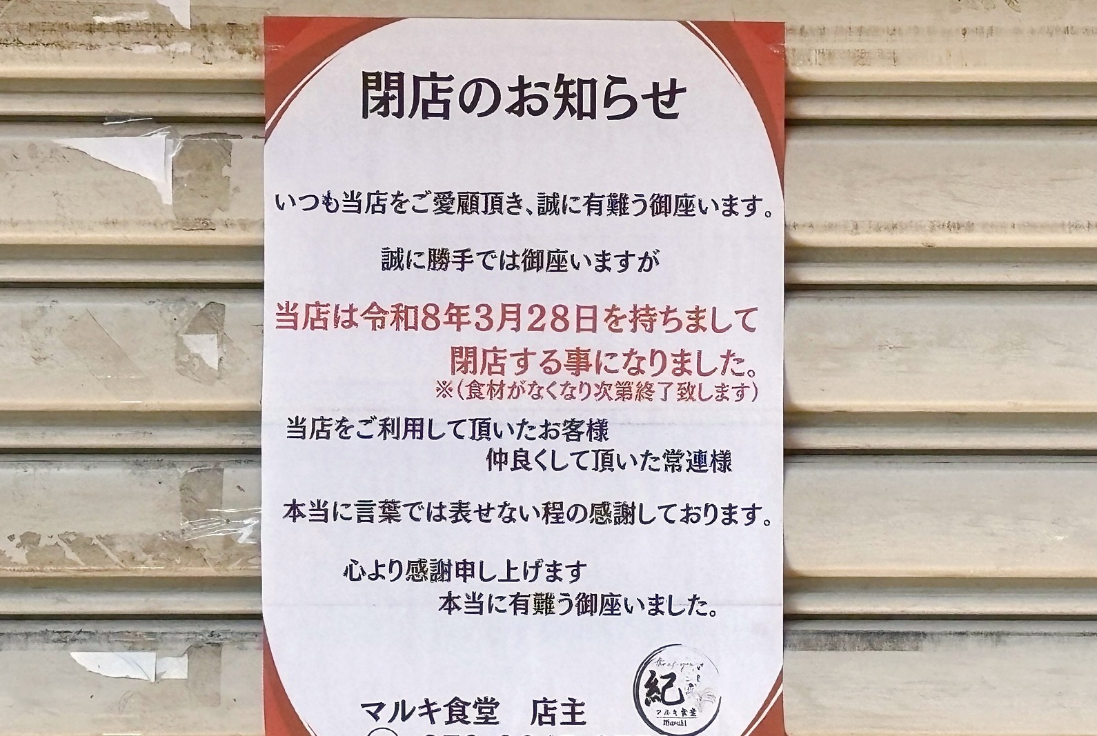 「マルキ食堂」さんが3月28日をもって閉店へ