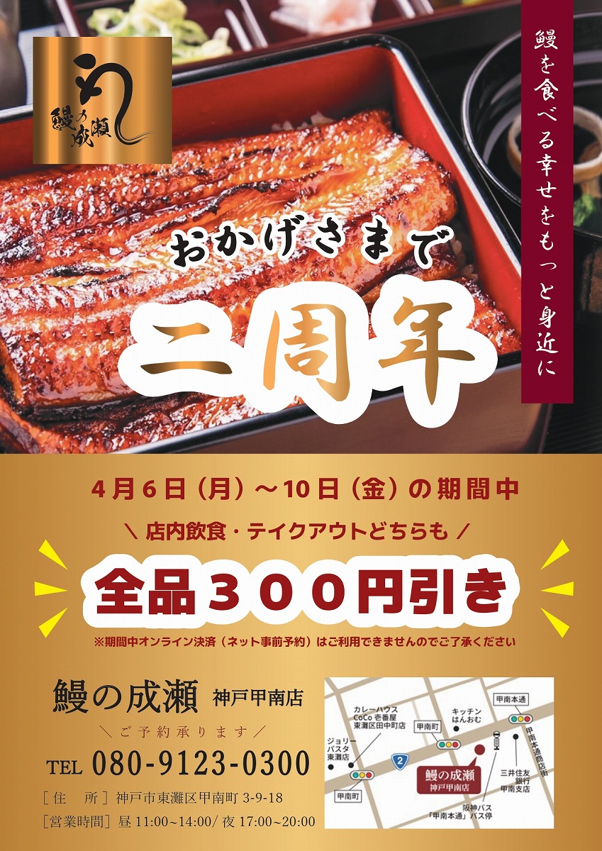 東灘・国道2号線沿いにある「鰻の成瀬 神戸甲南店」さんで2周年キャンペーンを4月6日(月)~10日(金)に開催!店内飲食・テイクアウトどちらも全品300円引きで大変お得ですよ、と読者様より情報とお写真をお寄せ頂きました。