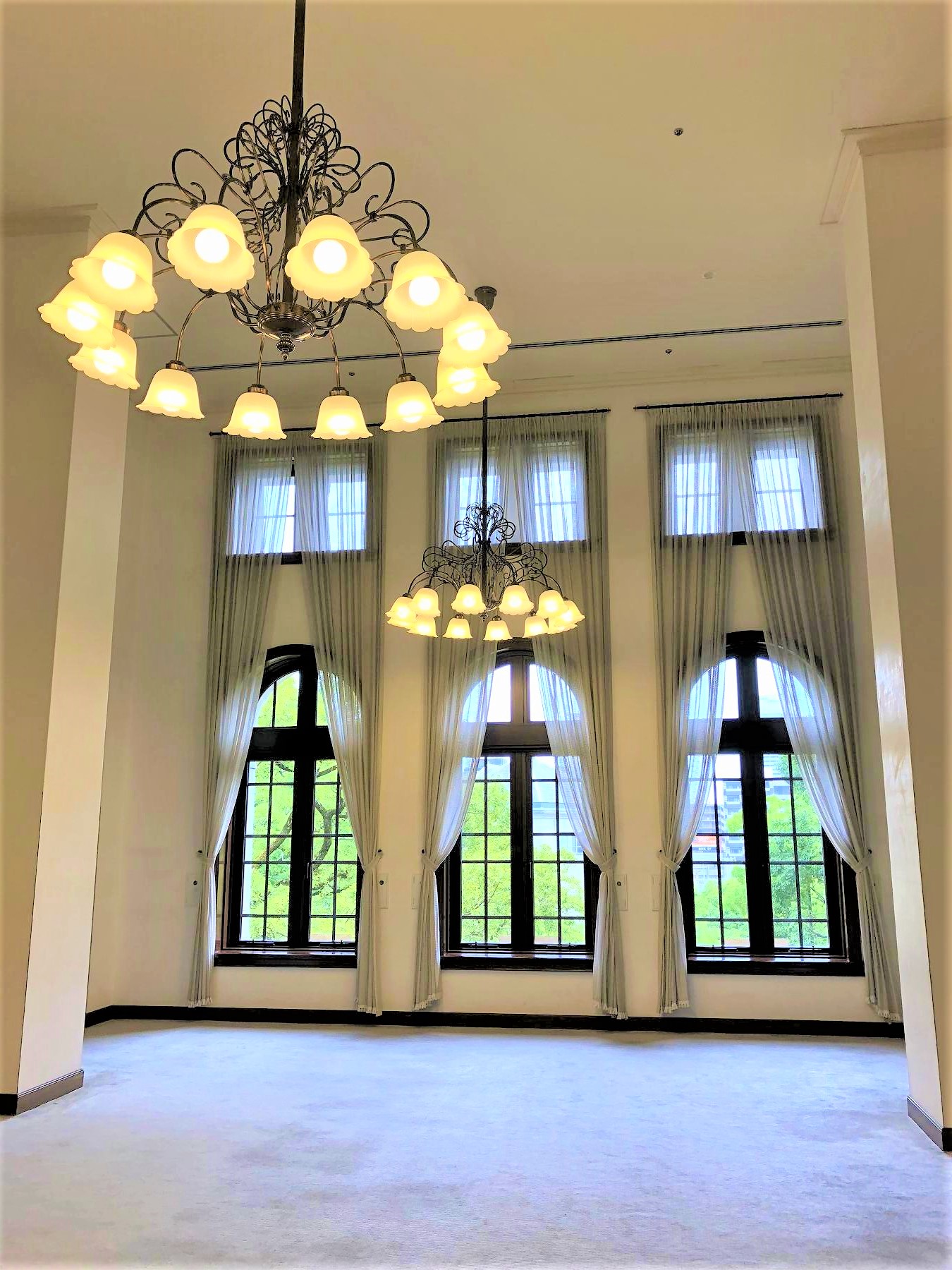 NHK連続テレビ小説「芋たこなんきん」の撮影でも使われた、大会議室へのエントランスの階段と吹き抜けは、大変立派な造りです。