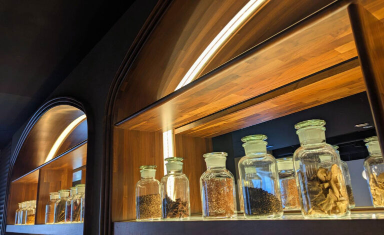 店内に並ぶ23種類のスパイスのディスプレイと、重厚感のあるカウンター。まるでオーセンティックバーにいるかのような“隠れ家空間”で、スパイスの香りとともにゆったりとした時間をお過ごしいただけます。