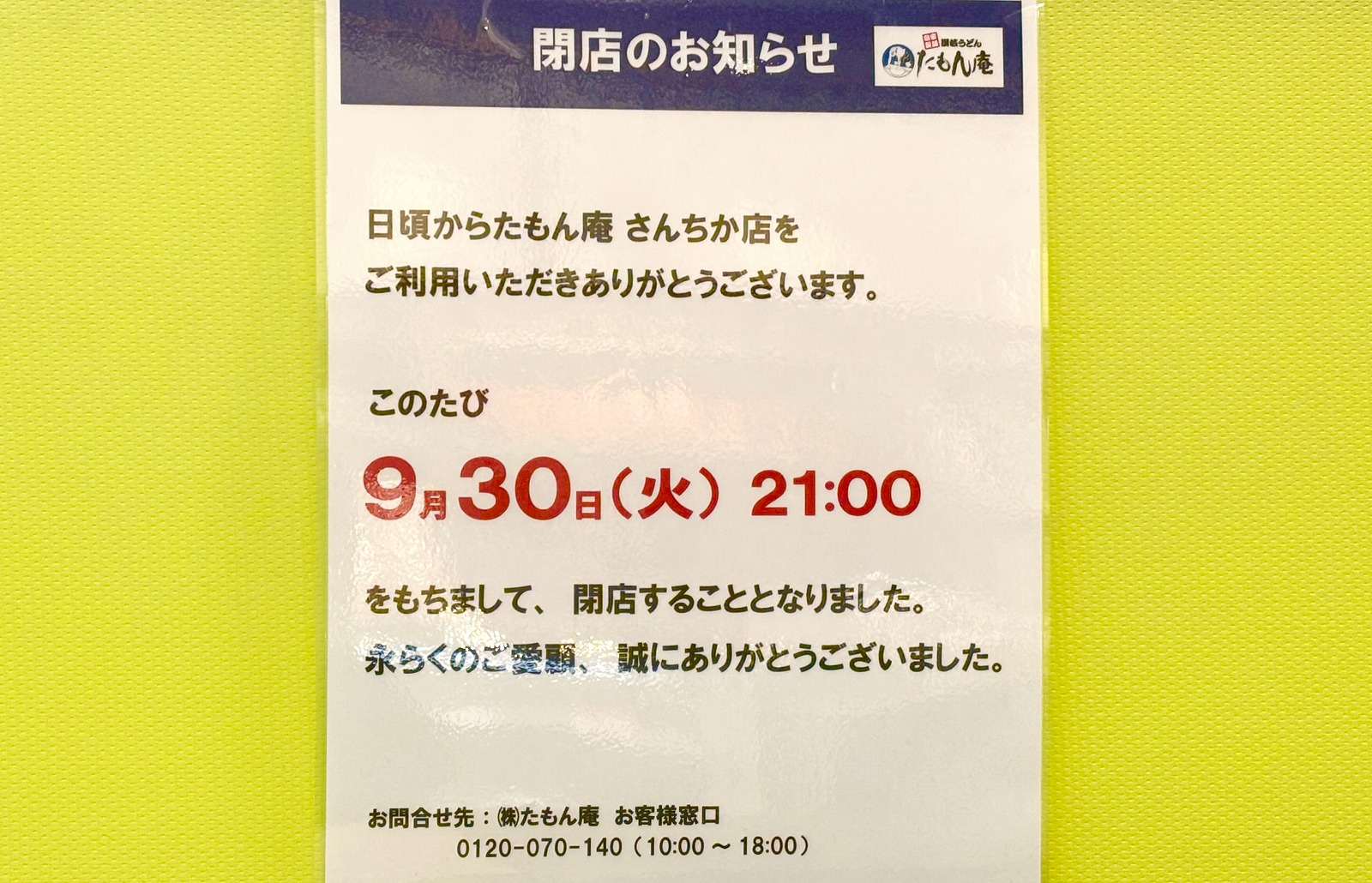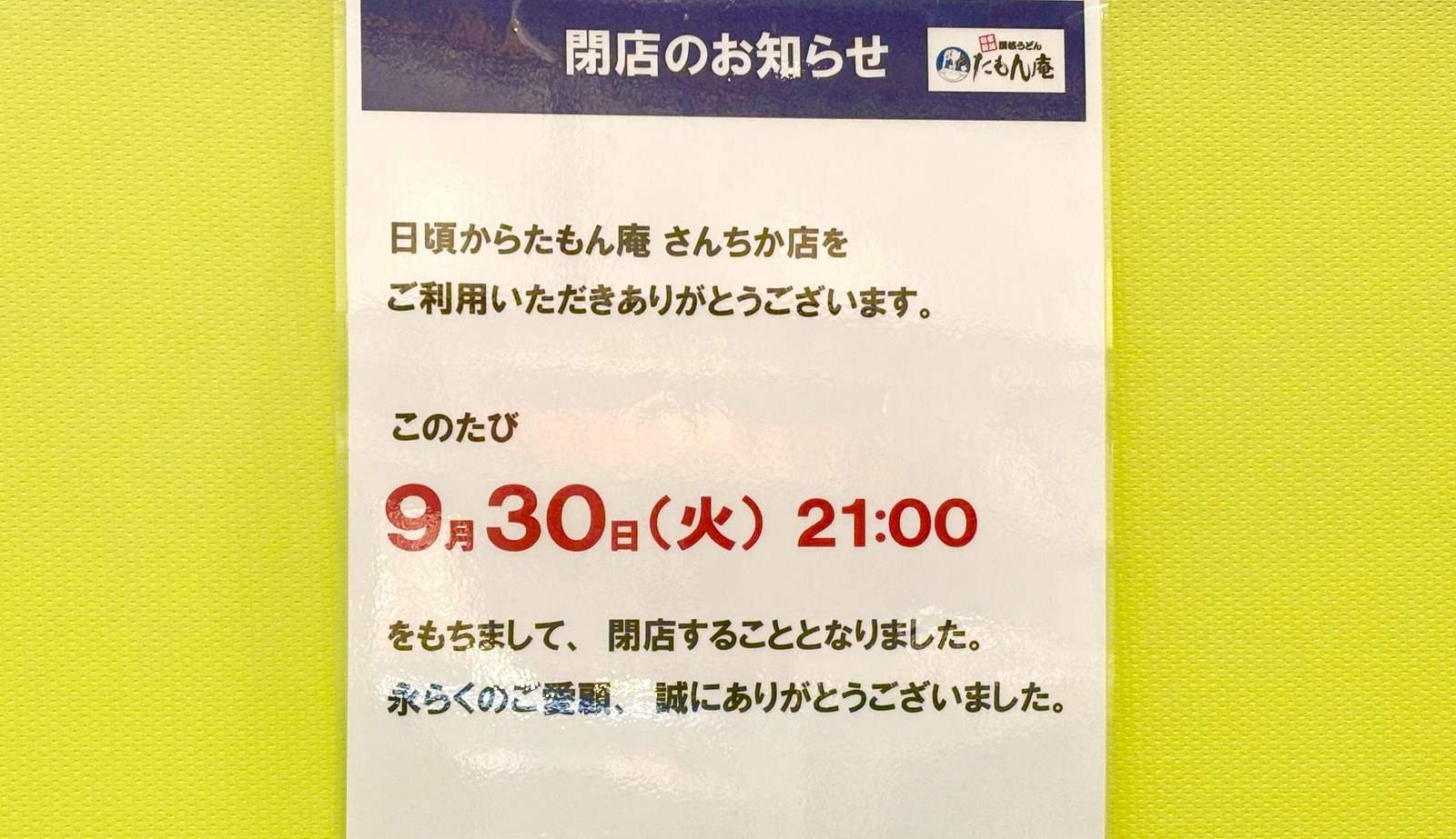 神戸三宮・さんちか麵ロードにあった讃岐うどんの「たもん庵 さんちか店」さんが9月30日をもって閉店されました #閉店情報