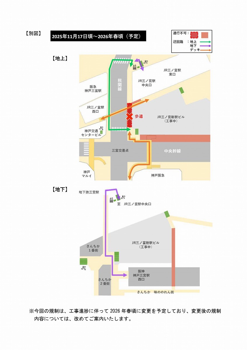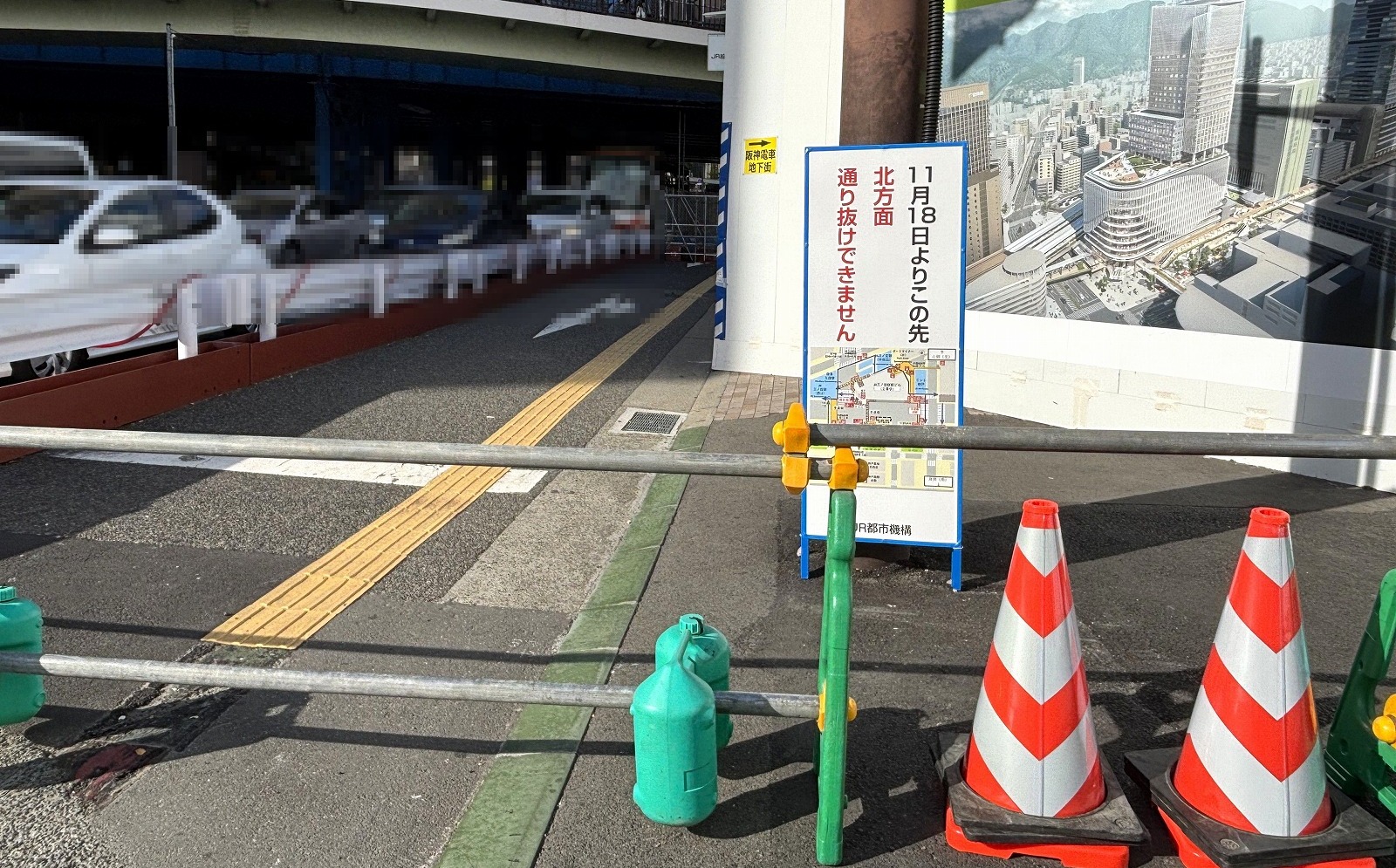 神戸交通センタービルから(仮称)JR三ノ宮新駅ビルまでを繋ぐデッキの工事着手に伴い、三宮交差点北東側の歩道が2025年11月17日~2026年春頃まで通行止めに #通行止め #三宮再整備