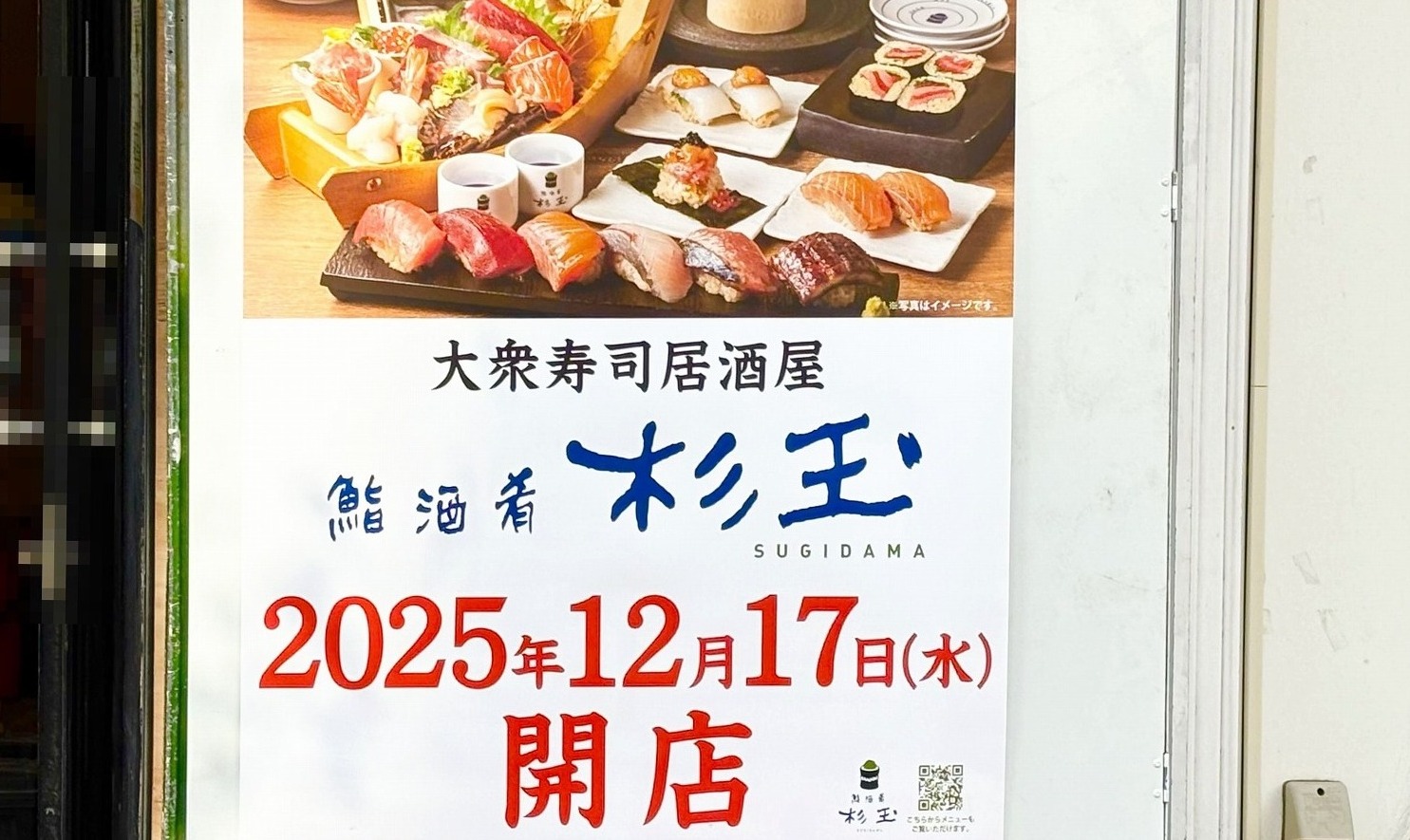 神戸元町エリアに大衆寿司居酒屋「鮨 酒 肴 杉玉 神戸元町店」さんが2025年12月17日(水)オープン予定ということで、ご案内がありました。