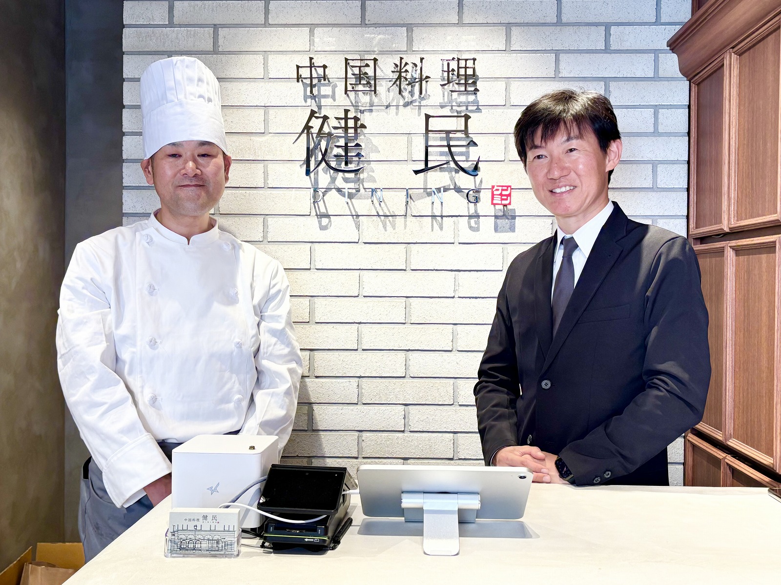 ケンミン食品株式会社 高村祐輝 代表取締役社長 様(右)、「健民ダイニング」料理長 松本竜太 様(左)とフォトセッションにて。