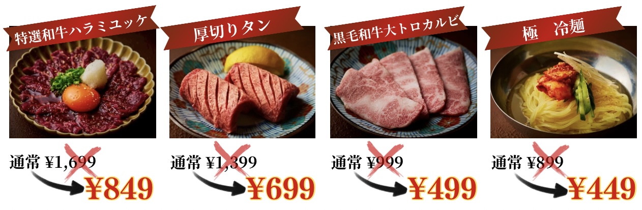 オープン記念として、四大名物“厚切りタン・冷麺・大トロカルビ・ハラミユッケ”が半額になるほか、