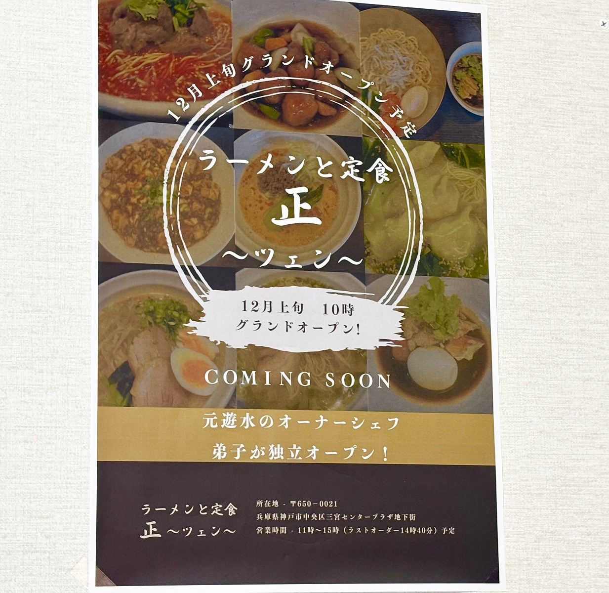 神戸三宮・センタープラザに、中華ランチとラーメンの「正(ツェン)」さんが12月21日(日)にオープンを予定されているみたい! #新規オープン #新店情報 #開店情報 #ラーメン