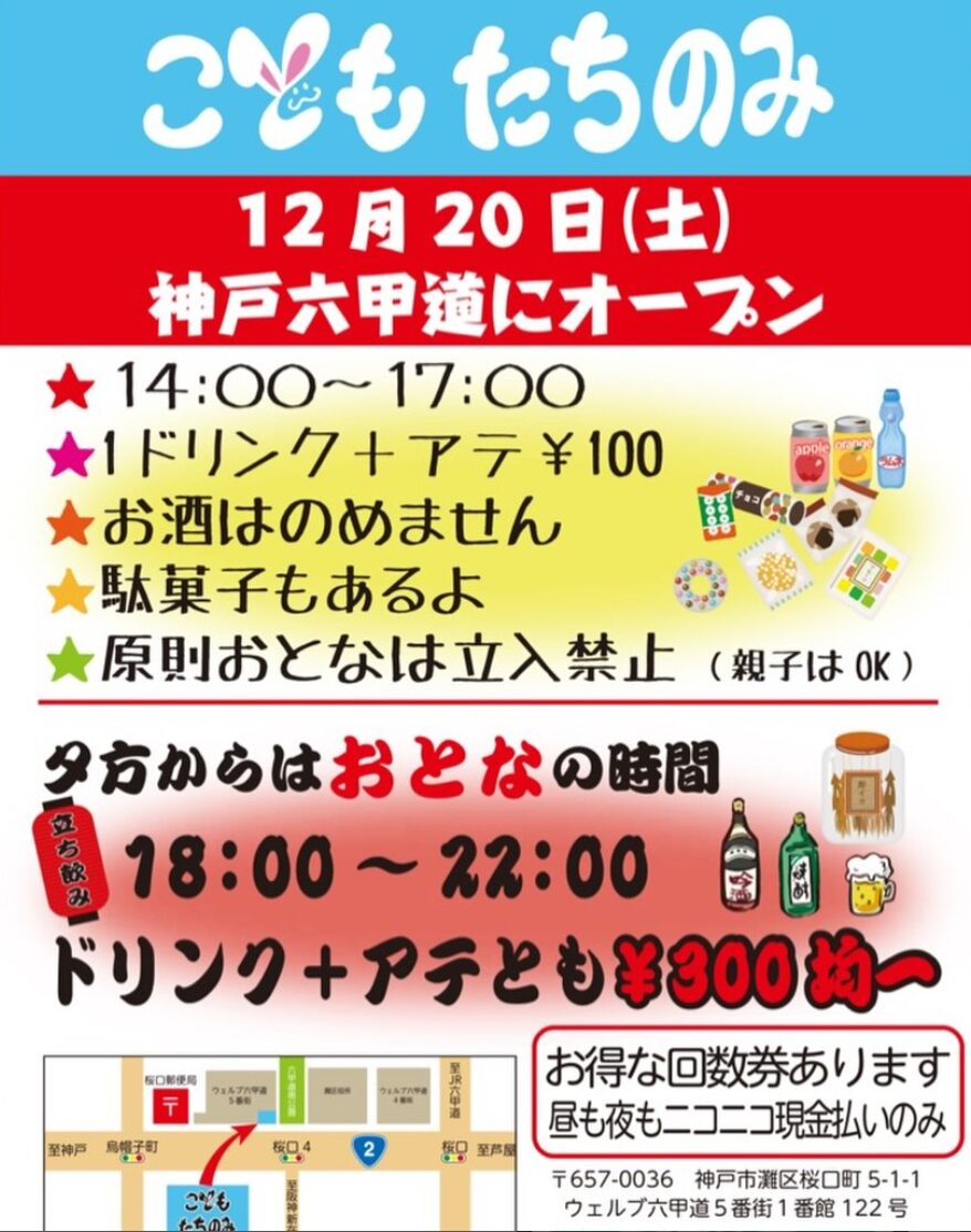 神戸・ウェルブ六甲道に「こどもたちのみ」さんが12月20日(土)にオープン予定!14:00~17:00は駄菓子メインの子ども時間、18:00~22:00は立ち飲みメインの大人の時間へと変化するみたい #新規オープン #新店情報 #開店情報 #こどもたちのみ