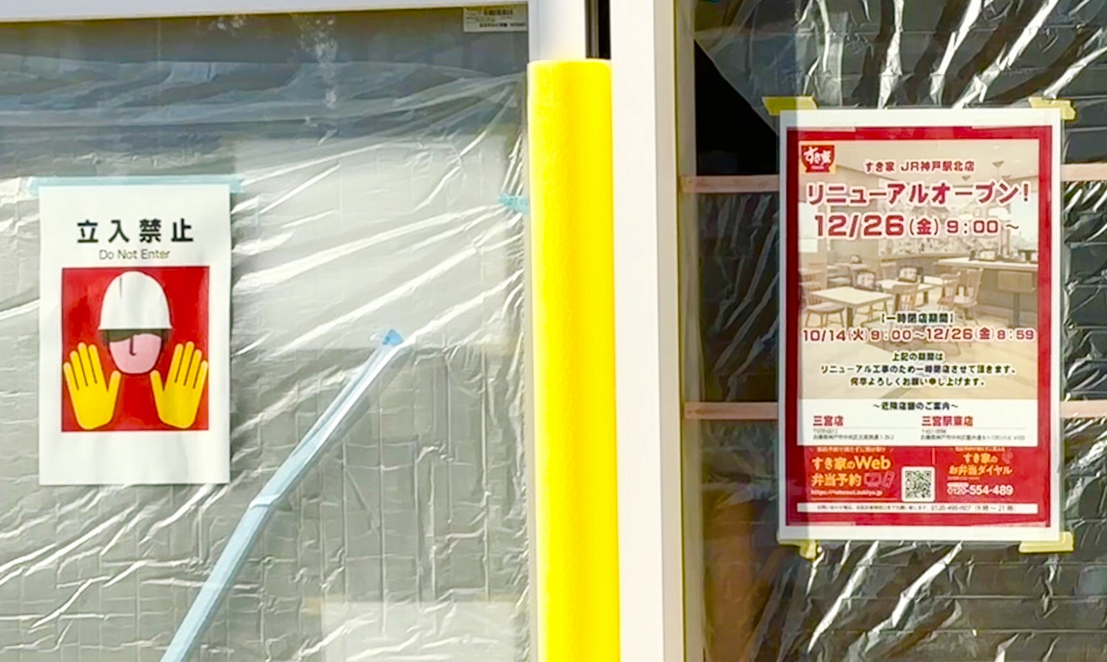 JR神戸駅の北側にある「すき家 JR神戸駅北店」さんが改装工事のため一時休業中。12月26日(金)9:00~リニューアルオープン予定ということで、ご案内がありました。
