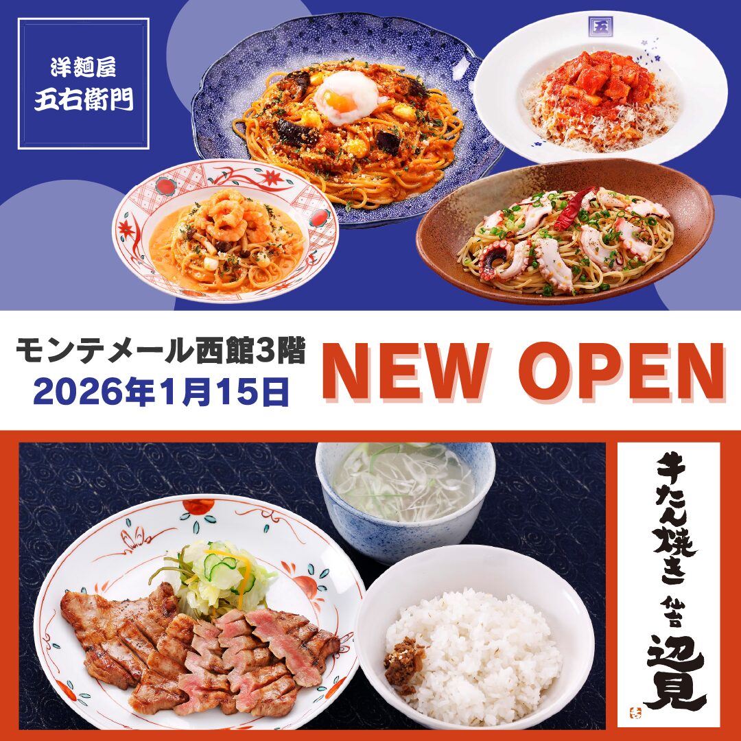 画像と情報の引用参照:モンテメールWEBサイト「2026年1月15日 NEW OPEN!洋麵屋五右衛門&牛たん焼き仙台辺見」