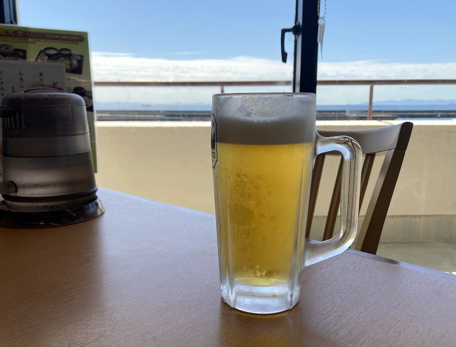 青い空と海を眺めながら、定食が来る前にまず1杯!たまにはこんな日があってもよいのです(笑)