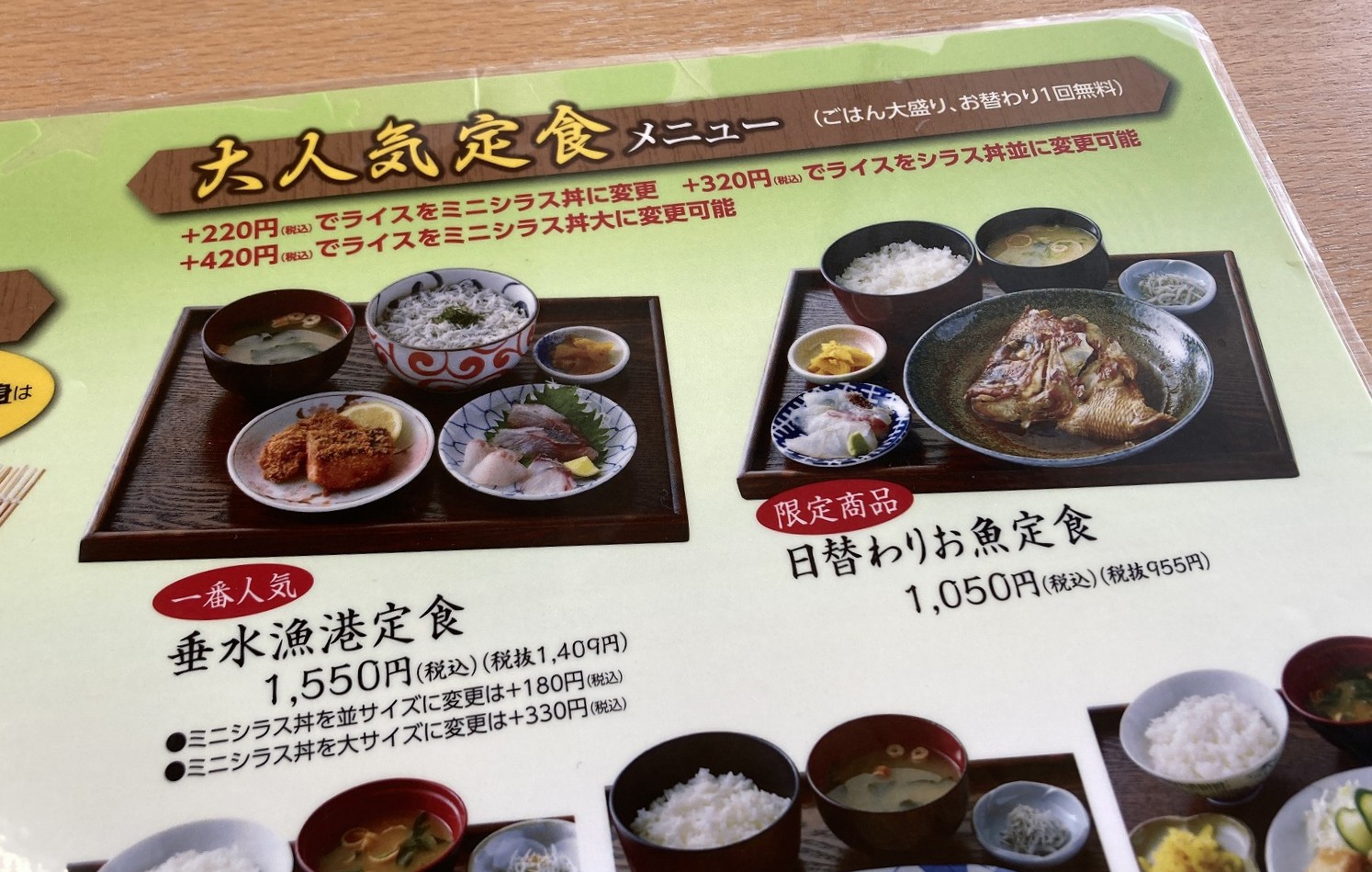 今回は一番人気の「垂水漁港定食」(税込1,550円)をオーダー。ミニシラス丼のサイズ変更ができるのがうれしいですね♪