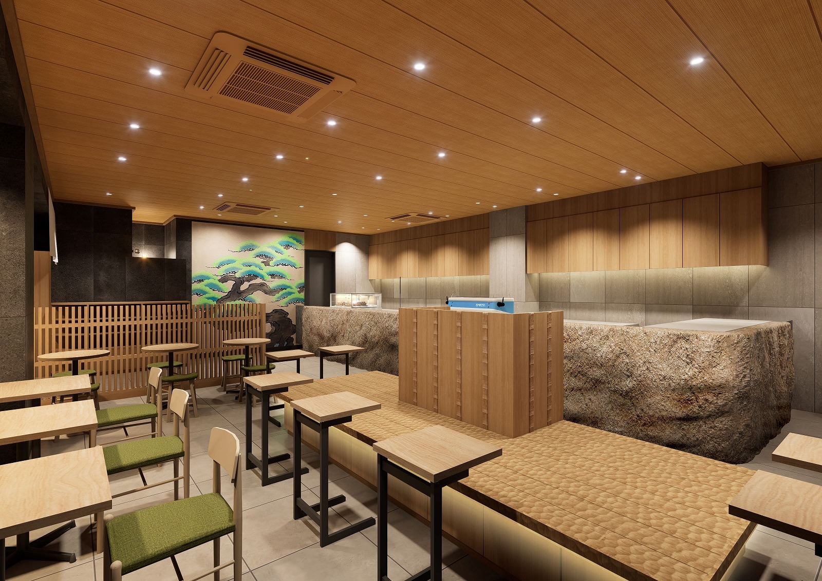 店内は京都らしい落ち着いた和のテイストが特徴で、松の絵を配した内装が奥にあります。「京都の庭」を散策しながらコーヒーを楽しんでいる感覚を味わえるように構成されたそうで、