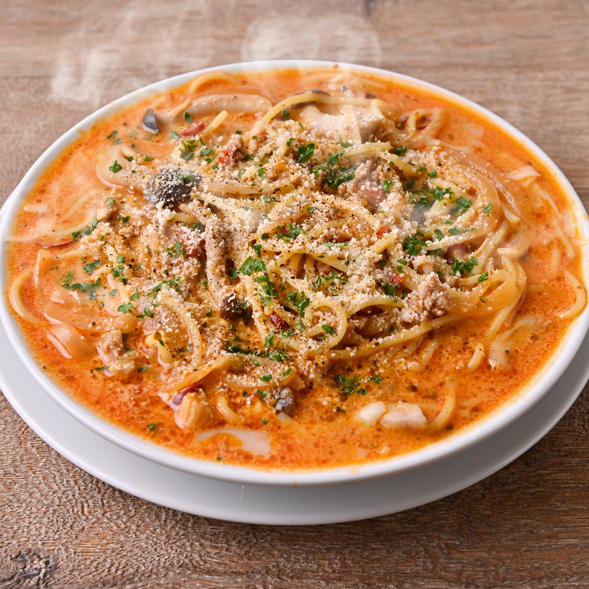 一口で、沼。“溺れるスープスパ”の看板、スープが主役の濃厚ロゼ。トマトの旨みとクリームのコクを濃厚にまとめた、溺れるスープスパの看板メニュー。麺に絡むロゼスープを最後の一滴まで飲み干して。