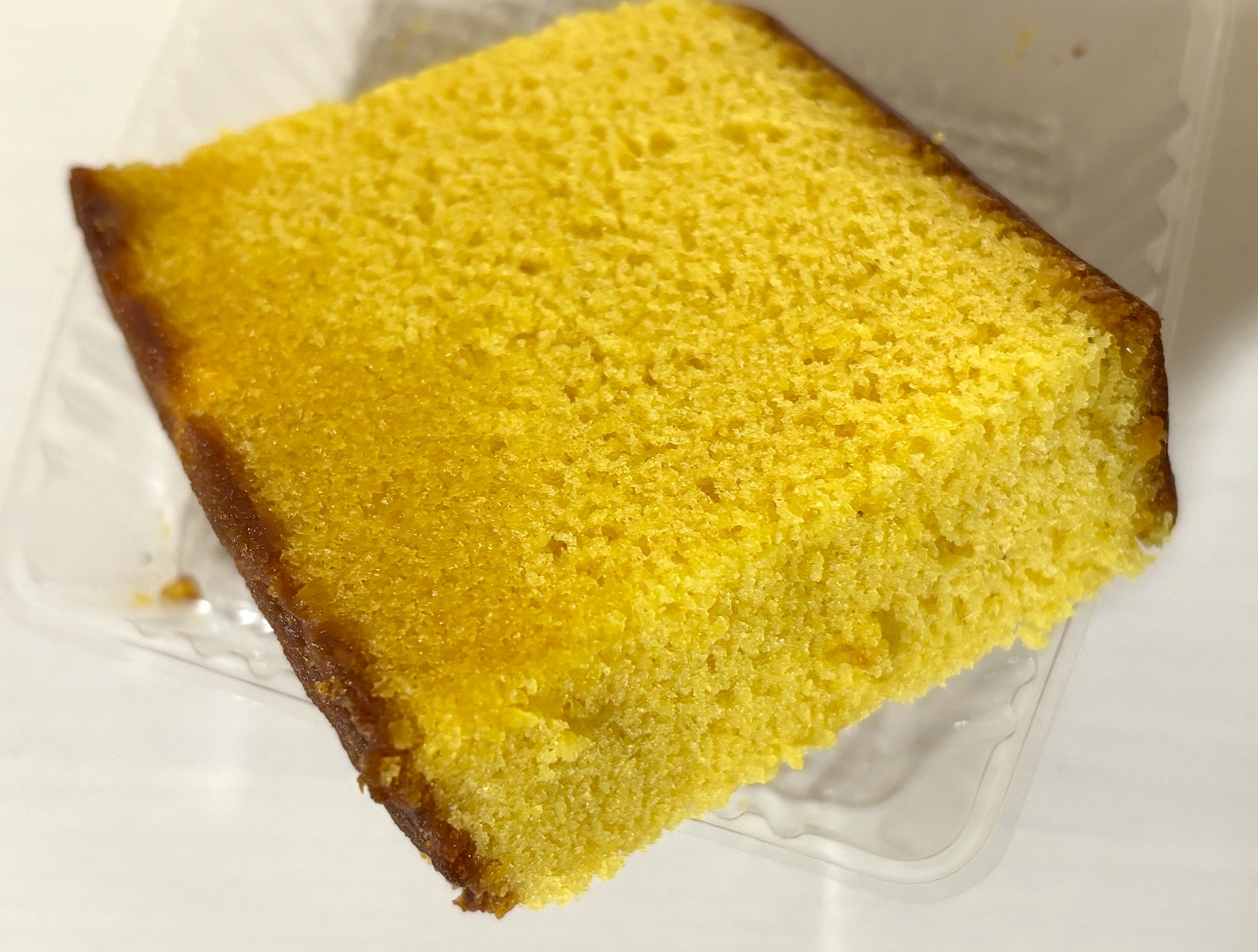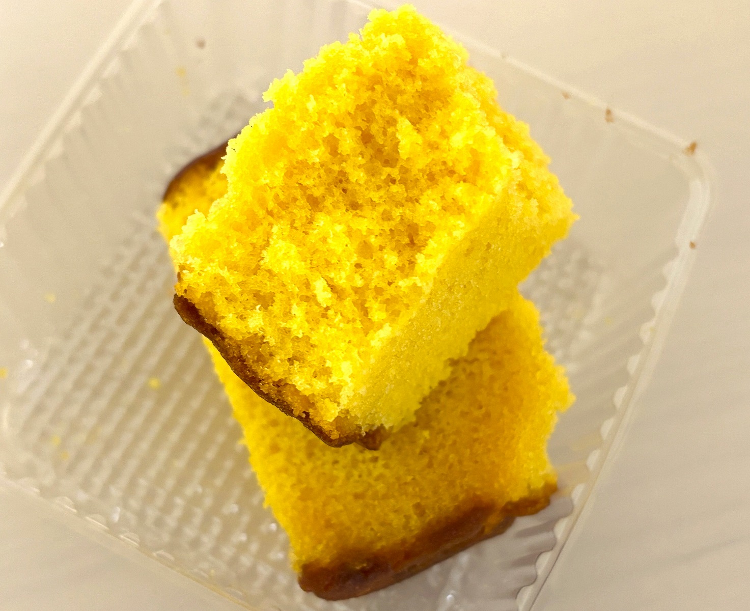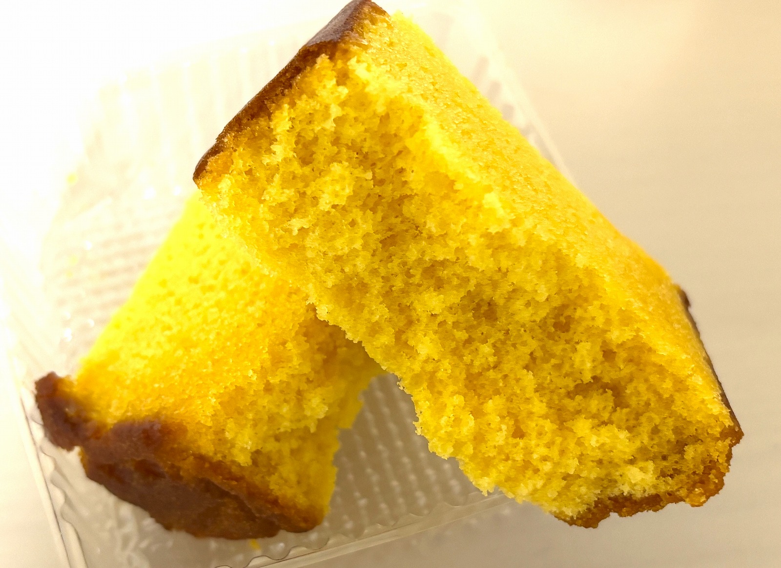内側のパッケージを開くとこんな感じでして、カステラの黄色が濃いめなのが特徴です。
