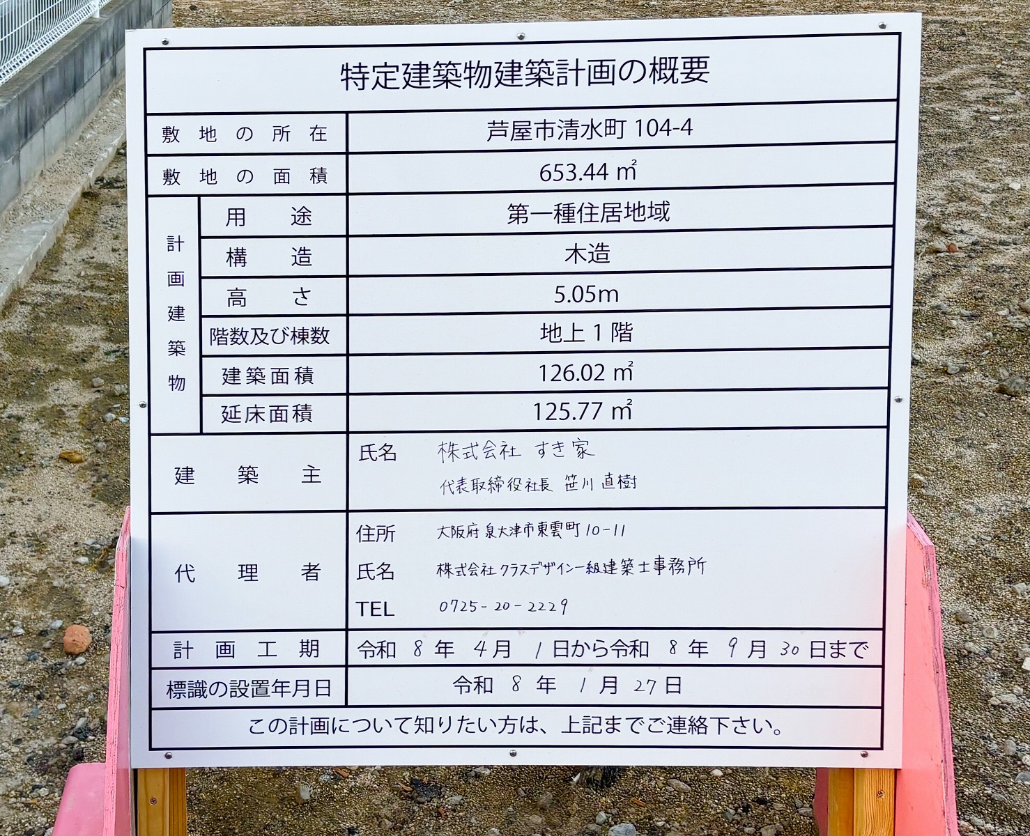 芦屋・国道2号線沿いに「すき家」さんが建設を予定されている模様で、ご案内が掲示されていました。