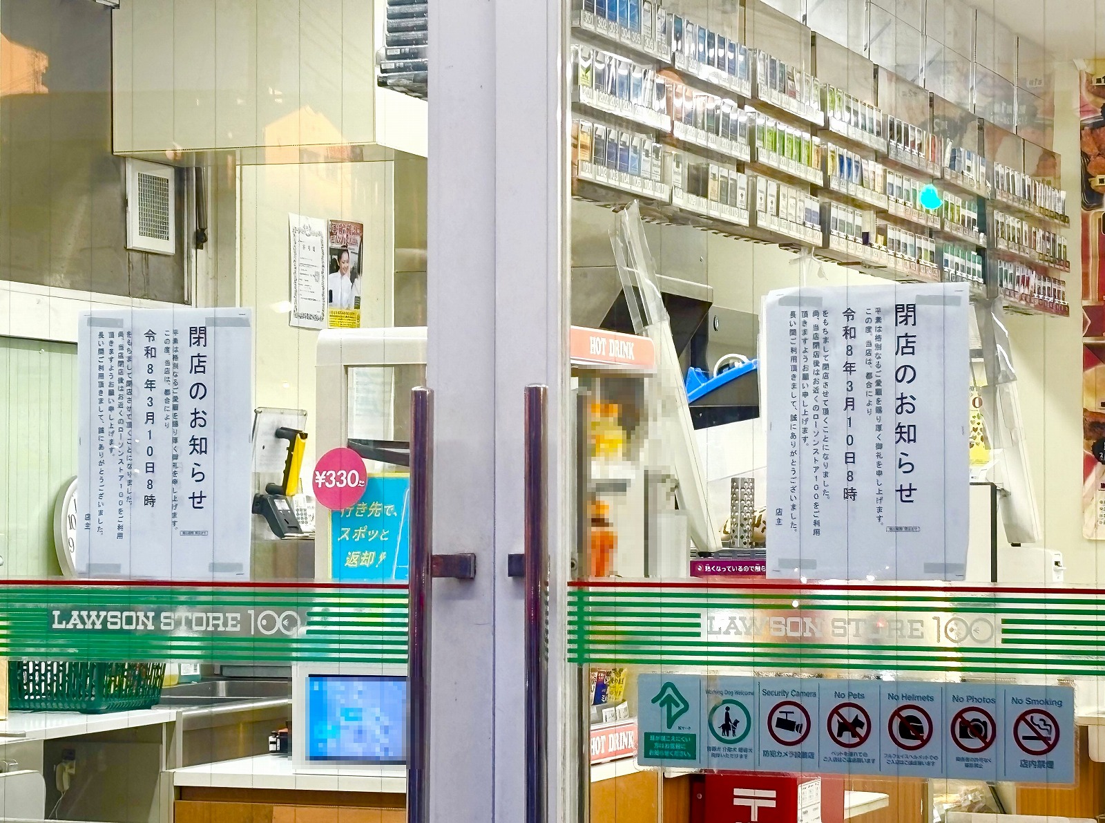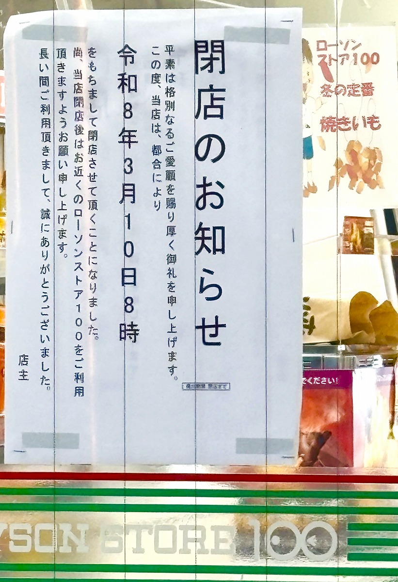 「閉店のお知らせ」がこちら。令和8年3月10日8時をもって閉店ということで、ご案内がありました。