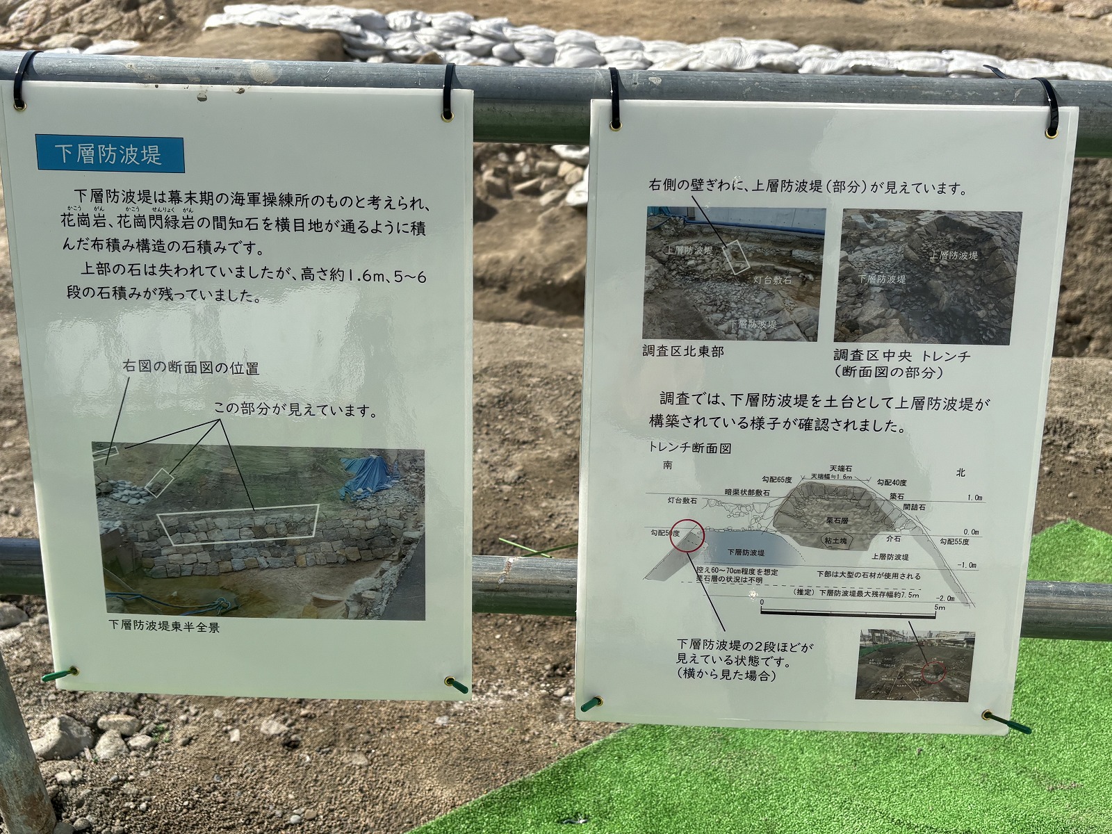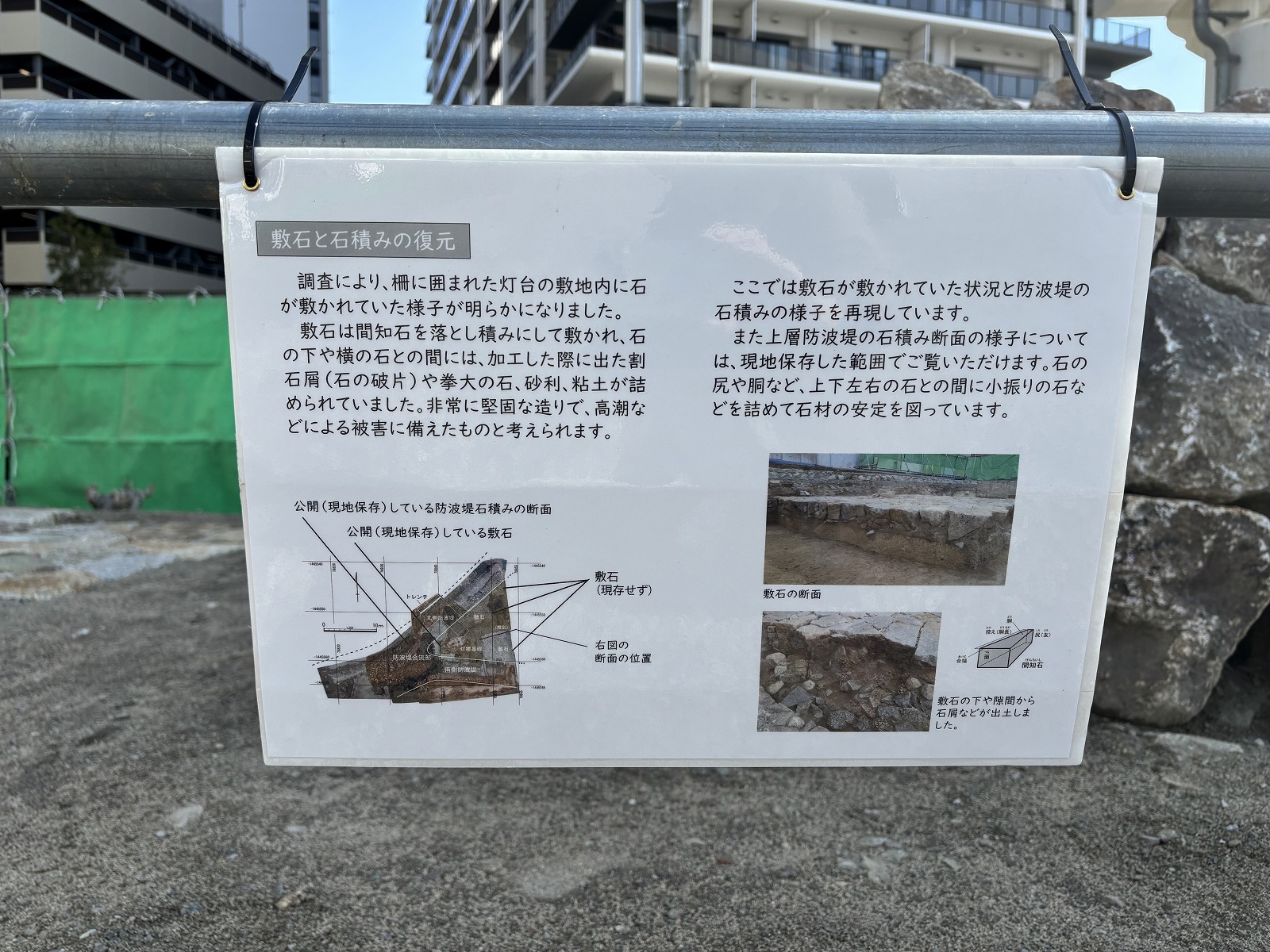 石積み防波堤などの遺構の姿を、現地で間近に見学することができます。