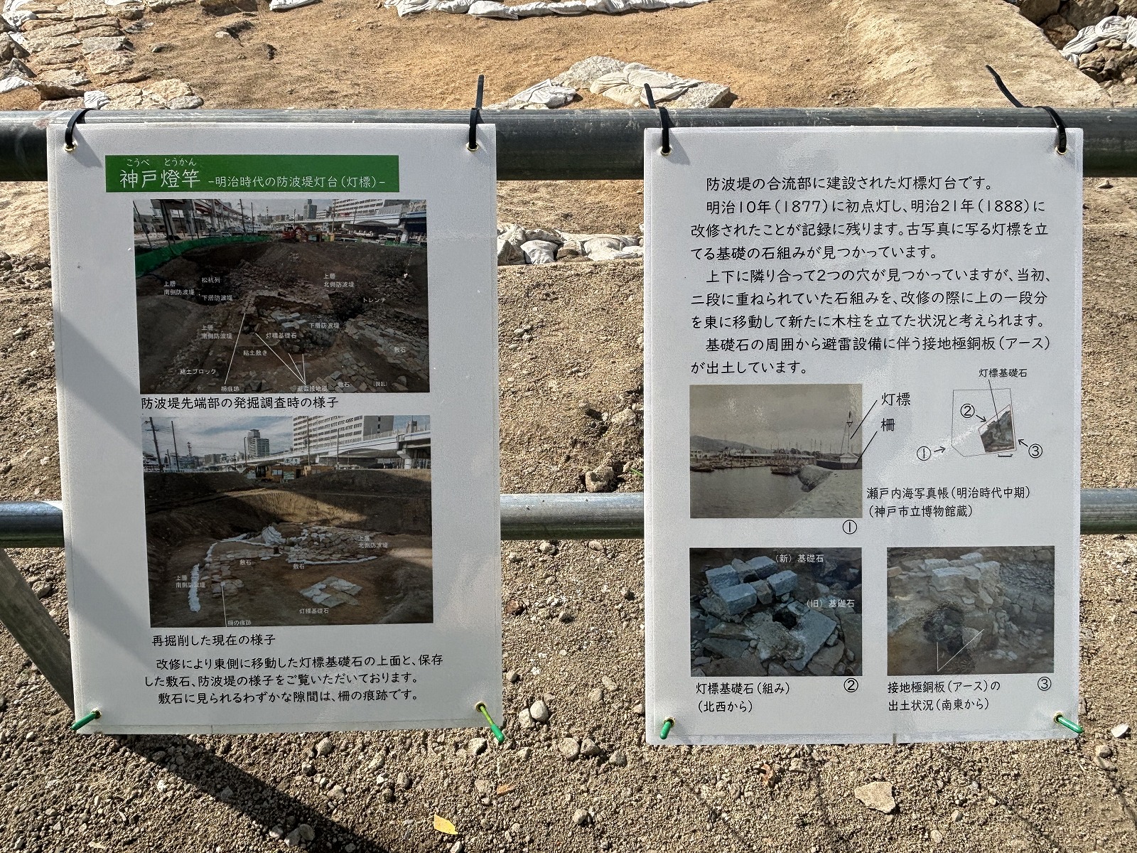 神戸港第一波止場の遺構は南北に2本の防波堤と神戸燈竿(こうべとうかん・海上交通のための標識)が設置された敷石面を確認しました。防波堤、敷石ともに表面に間知石(けんちいし)を並べて造られています。これらは明治時代中期の古写真や古地図と位置や形状が合致しており、発掘調査成果と歴史資料が結び付く貴重な成果となっています。