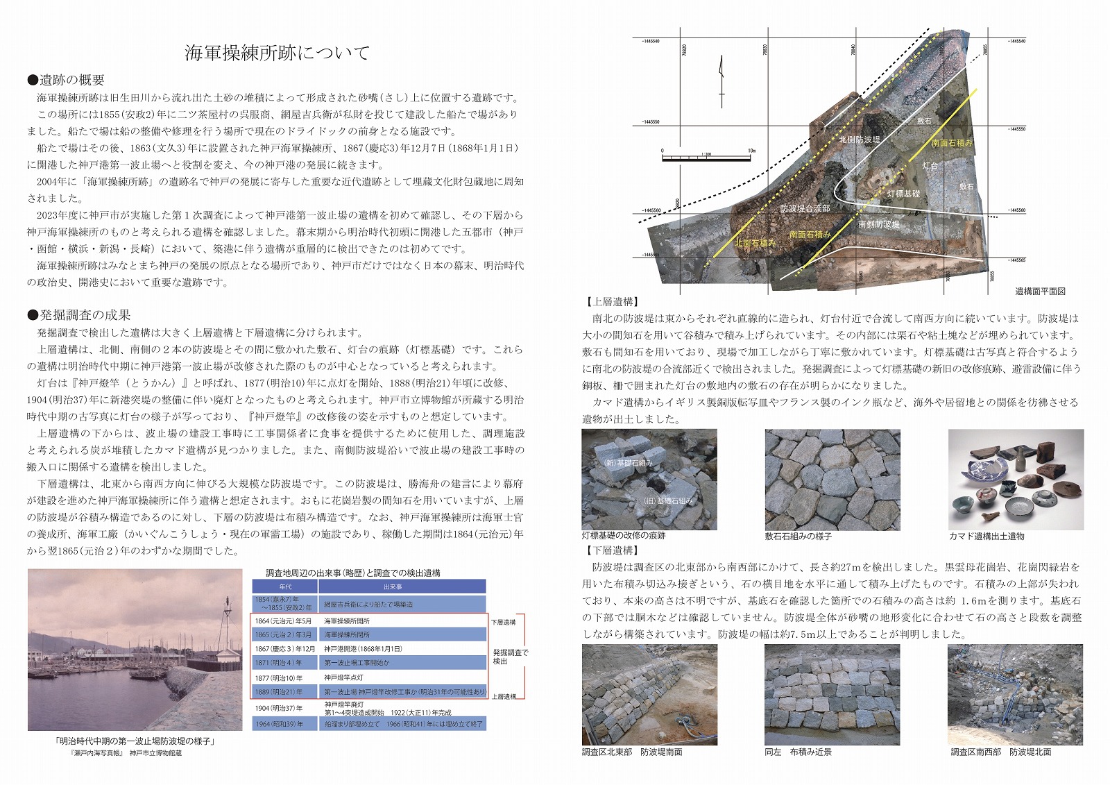 2023年度に神戸市が実施した埋蔵文化財発掘調査によって神戸港第一波止場の遺構を初めて確認し、その下層から神戸海軍操練所に伴う可能性のある遺構を確認しました。