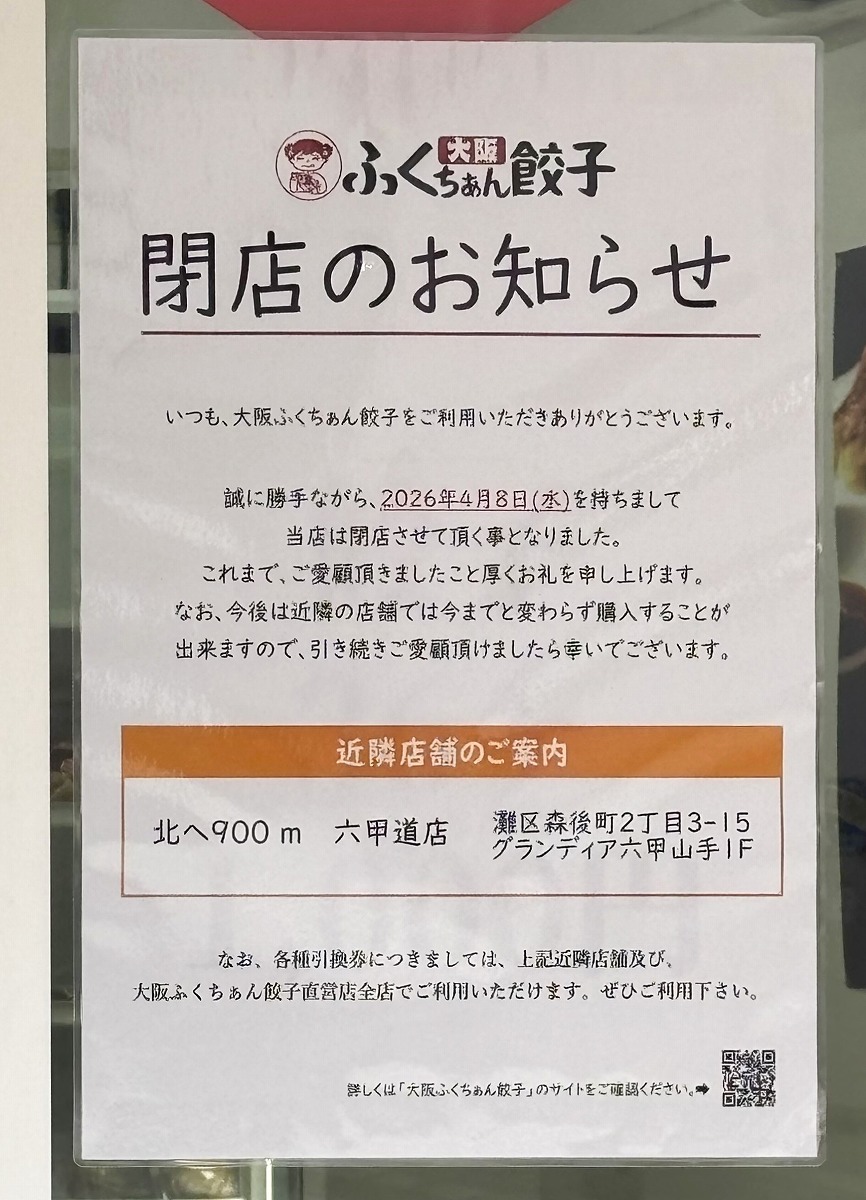 神戸・新在家にある餃子の無人販売所「ふくちぁん餃子 工場直売所 新在家店」さんが2026年4月8日(水)をもって閉店されるそうで、ご案内がありました。