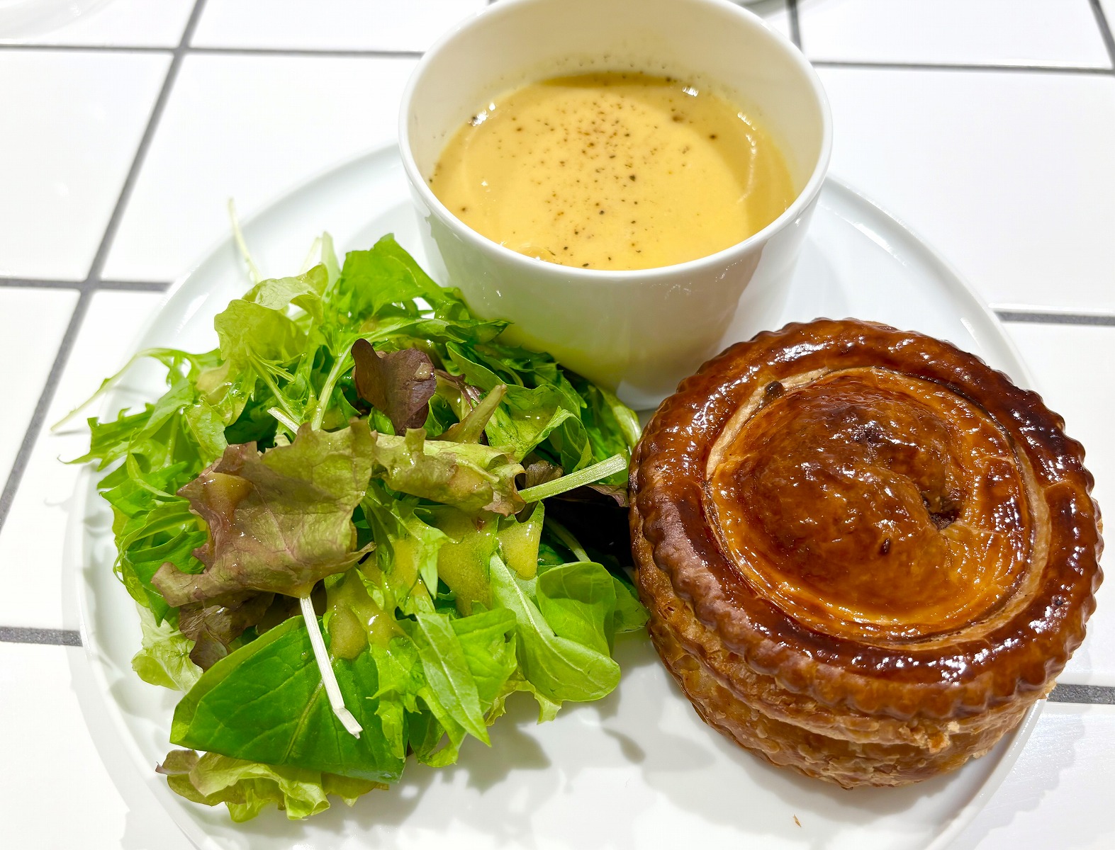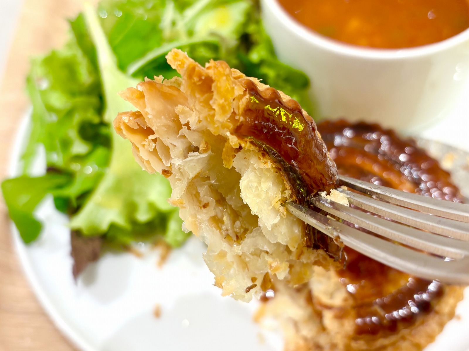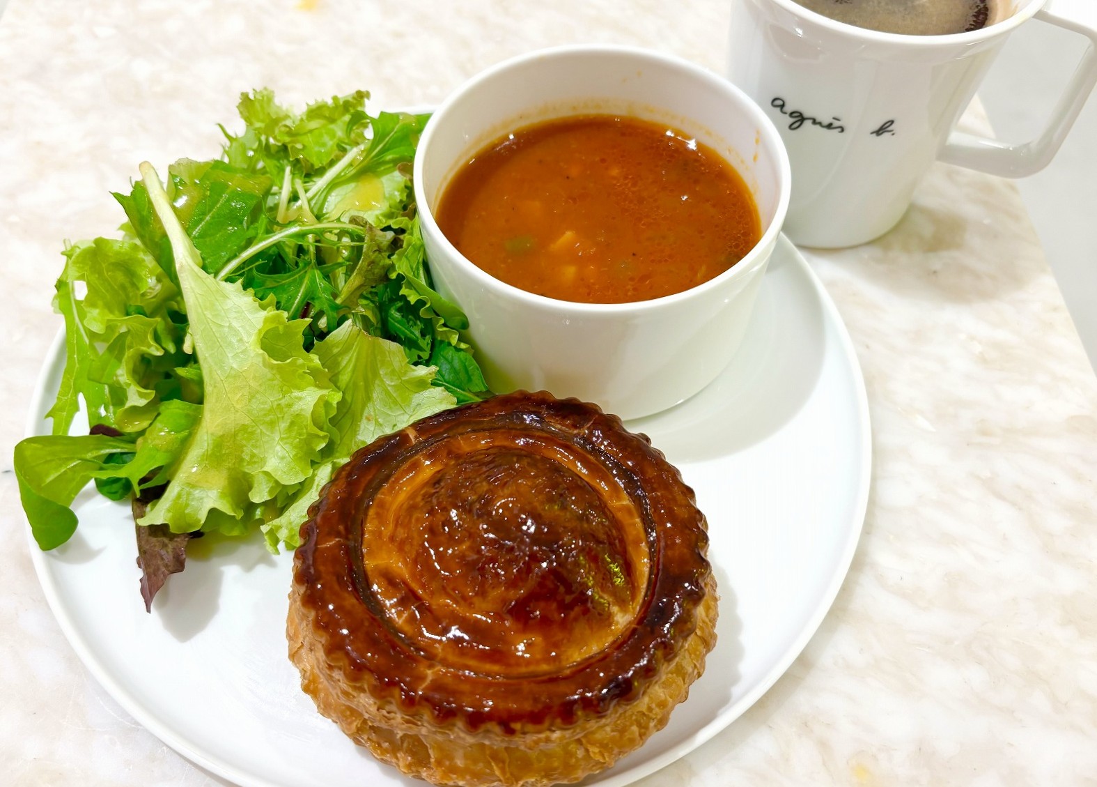 神戸牛で作ったフィリングをバター香るサクサクのパイで包んだ「ユーハイム」のミートパイが食べられる「神戸牛のミートパイセット」は、ミニサラダ、スープ、ドリンクが付いており、