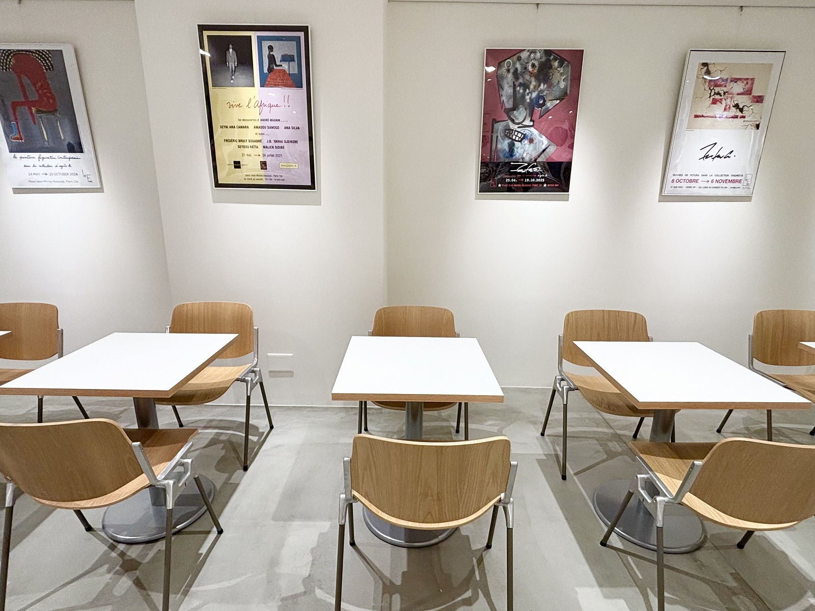 席数は36席と広くゆったりとしており、これまでの展示会やアートのご案内が壁にディスプレイされています。