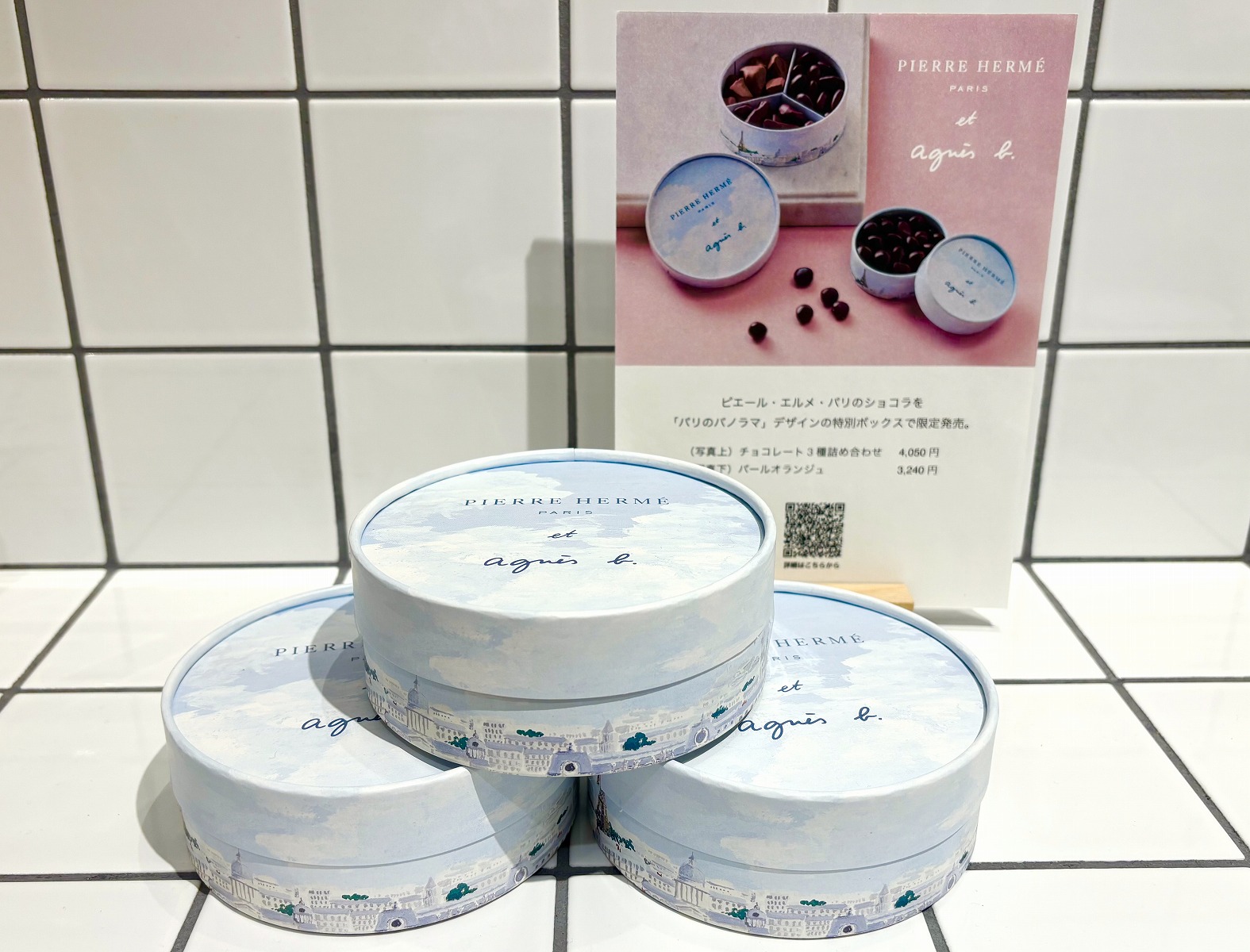 ピエール・エルメ・パリで人気の「チョコレート3種詰め合わせ」と「パール オランジュ」も限定販売されており、「パリのパノラマ」が描かれた特別ボックスがワクワクしますね。